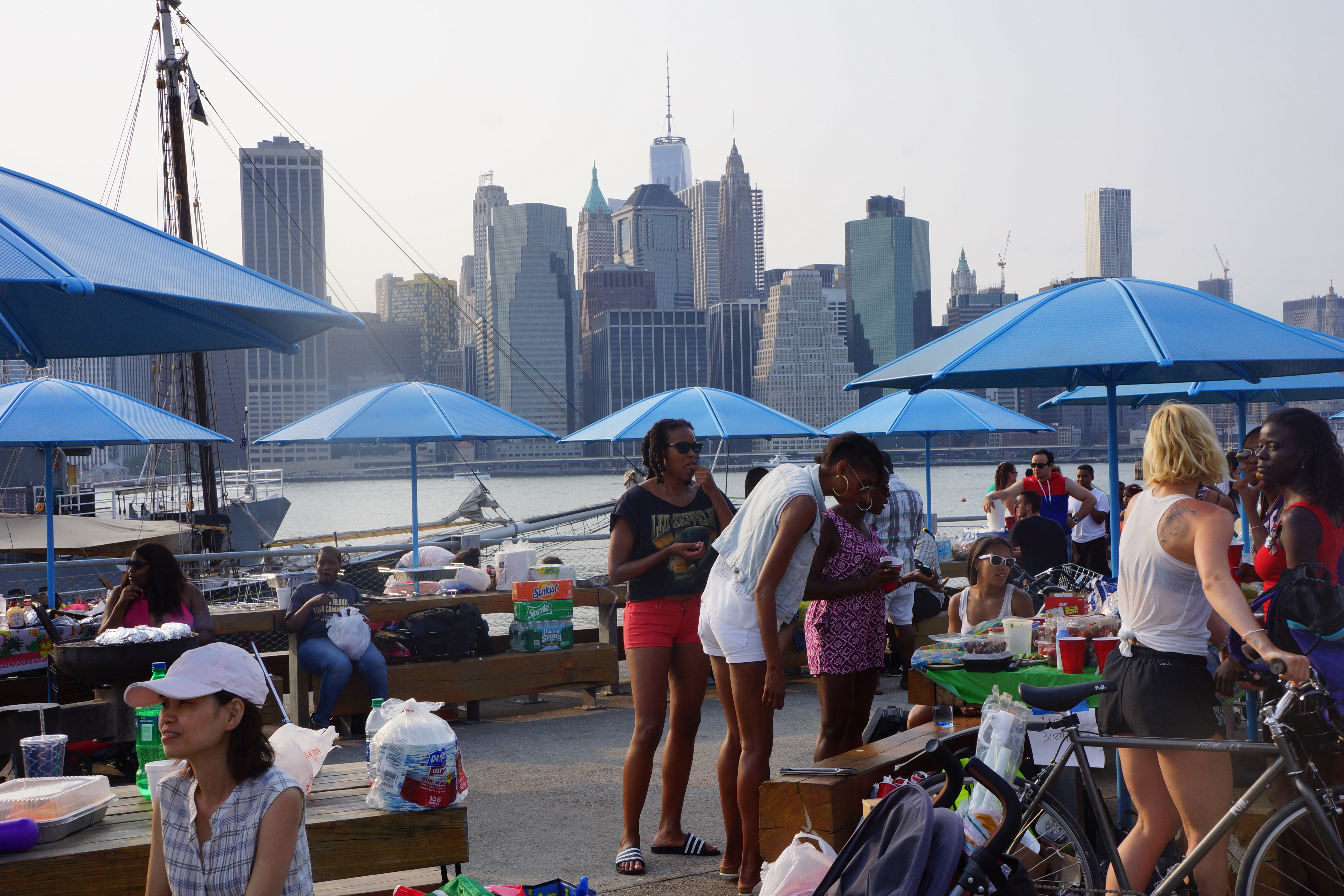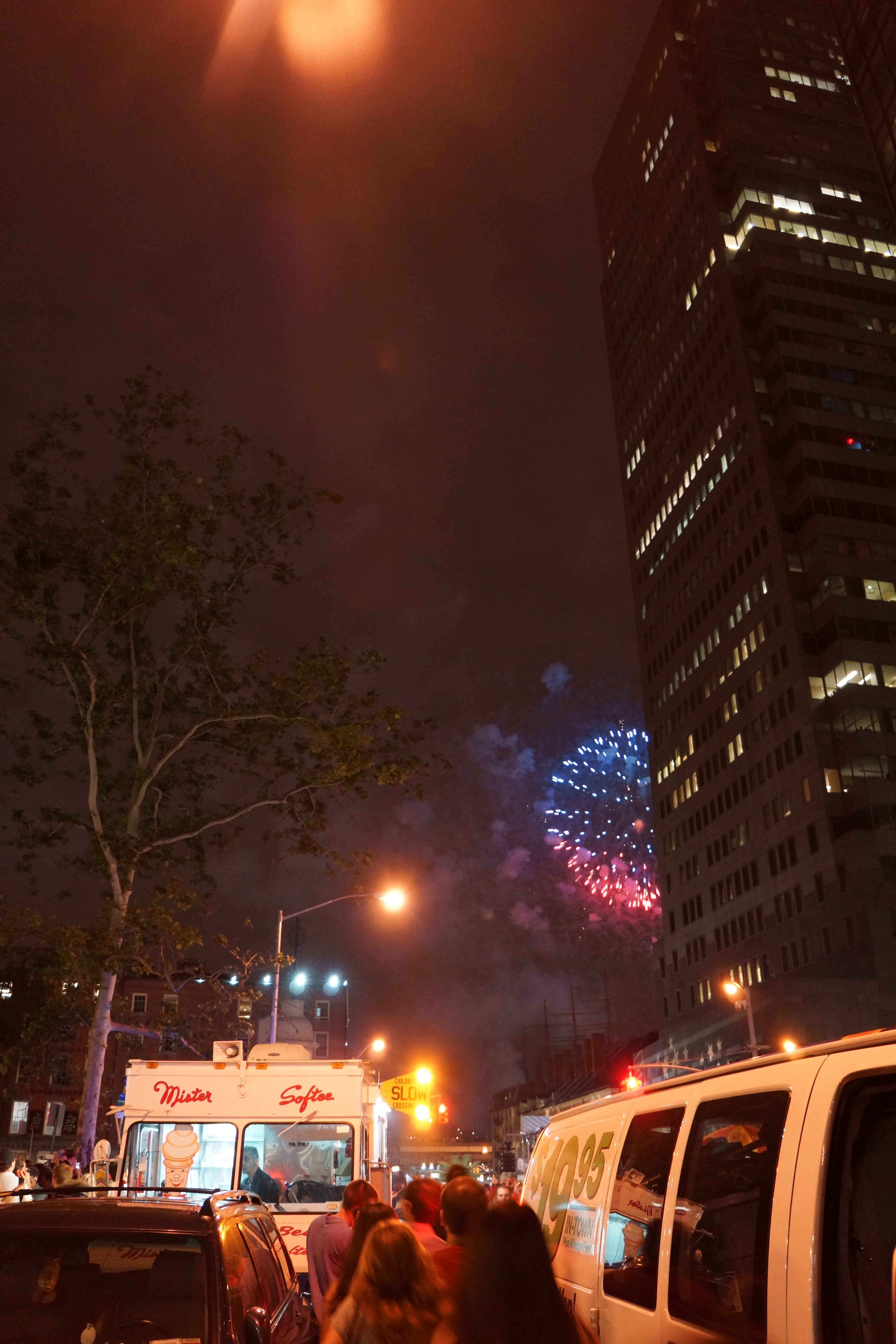 Später am Tag rast das NYPD unter hektischer Sirene durch den Central Park, in dem die New Yorker – und ich – auf Wiesen und Felsen in der Mittagspause entspannen. Überall Sirenen. Und Parks! Die Stadt ist süchtig nach grün, der Asphaltdschungel braucht richtigen Dschungel zum Ausgleich, die gläsernen Fassaden wollen grün spiegeln. Im Prospect Park in Brooklyn steigt ein Drache auf und Grillgeruch in die Nase, kleine bunte Grüppchen tollen mit Bällen und Hunden auf der großen Wiese hinter der Grand Army Plaza. New York ist ein beispielloser meting Pot. Hautfarben, Gesichtszüge, Körpermaße – alles schmilzt hier in der Hitze zu einer Einheit und bleibt gleichzeitig in seiner Vielfalt erhalten. „Happy 4th“ klingt an meine Ohren. Independence Day. Ob ich mir den Zeitpunkt meiner Ankunft bewusst ausgesucht habe,für einen richtig amerikanischen Einstieg? Not really…aber hier macht sich ohnehin jeder ein bisschen über übertriebenen Nationalstolz lustig. Beim Feuerwerk später versperren die Wolkenkratzer mir so sehr die Sicht, dass ich das Spektakel eigentlich nur akustisch verfolgen kann. Es hallt in den Hochhauscanyons. Nun ja, optisch ist zumindest die Reflektionen in den Fassaden drin.