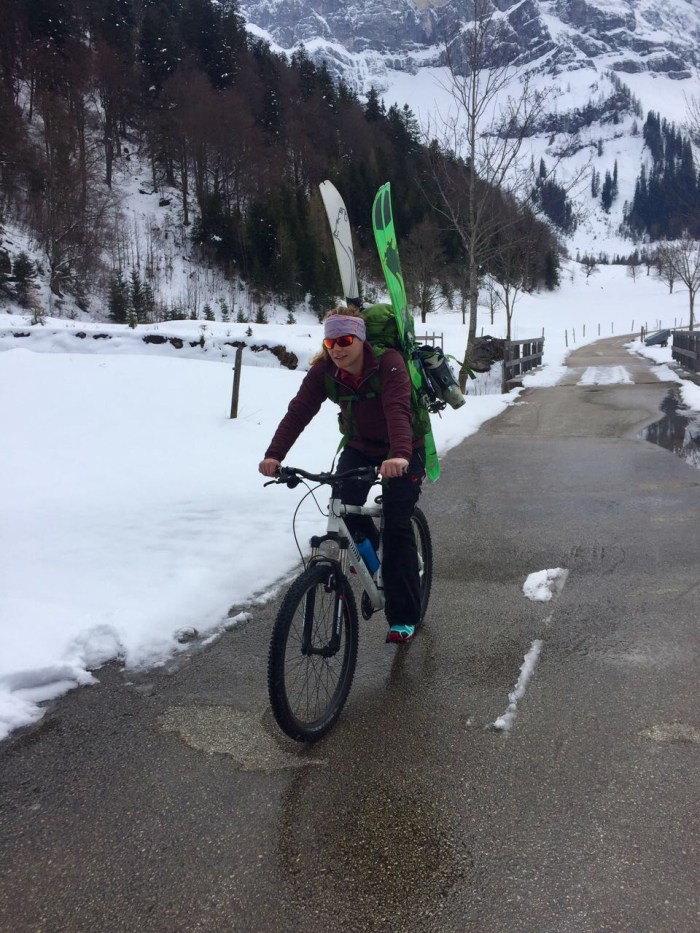Sich den Freitag freizunehmen und trotzdem früh aufzustehen, ich dachte das machen alle Münchner fast jeden Freitag. Aber als wir gegen 8:30 Uhr ans Ende des Eng-Tals rollen stehen erst einige wenige Autos schief am Straßenrand halb in den Schneegraben geparkt. Glitzernd bricht sich die Sonne auf dem nicht mehr ganz so frischem Schnee – aber genug ist noch da. Wir entrollen die Felle, schlüpfen in die Skistiefel und testen den Lawinen Pieps. Dann führt uns die Spur der wenigen frühen Vögel auch schon hinein, in den Wald und schließlich in steileres, offenenes Terrain gen Gipfel. Die Beine arbeiten gut, ich bin mir sicher, dass ich diese Tour als lange Wochenendeinheit im Lauftagebuch verbuchen kann. Unterwegs lassen wir eine Hülle nach der anderen fallen bis wir auf dem Gipfel schlussendlich, sonnenhungrig wie in einem Skimovie aus den 80ern, nur noch in SportBH zum Bräunen im Schnee liegen. Rasant geht es dreifach so schnell bergab wie bergauf. Der angetaute Schnee ist so schwer, dass ich mich ab und zu zur Seit plumpsen lassen muss, weil meine Oberschenkel zu bersten drohen. Unten am Auto sind wir seelig. Kurz nach Freitag Mittag und schon glücklich, als ob man eine Woche im Urlaub gewesen wäre.