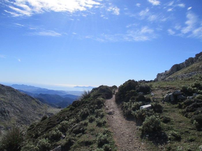 Ironman in Port d’Alcudia heute. Überall hängen die Schilder. Wir scherzen noch, dass wir ganz froh sind heute keine diversen Kilometer schwimmen, radeln und rennen zu müssten. Hätten wir gewusst, was heute auf uns wartet. Ironman Qualitäten hatte dieser Wandertag streckenmäßig zwar nicht ganz, aber psychologisch war die Wanderung ziemlich strapaziös. Kurz und knapp: Die Etappe von Lluc bis Soller hat uns um die 30km bei voller Sonneneinstrahlung auf die Sohlen gespult, inklusive Blasen an fast jeder erdenklichen Stelle der Zehen. Wie kann man auch so blöd sein und nur mit Laufschuhen losziehen. Dazu machte uns eine ‚verseuchte‘ Quelle zu schaffen, auf die wir zwecks Trinkwasserversorgung gezählt hatten. Das hieß für die letzten 3-4 Stunden kein Wasser mehr. Feste Nahrung beschränkte sich auf eine letzte Dose Thunfisch und ein paar Mandeln. Ich war sowas von bedient! Ronja war gegenüber dieses Nahrungsmangels deutlich toleranter, ich dagegen war für ein, zwei Stunden richtig schlecht drauf. Aber wie die meisten nervigen Situationen stellte auch diese mich auf eine lehrreiche Probe. Irgendwann war ich selbst so genervt von meiner schlechten Laune inmitten dieses Paradieses, eine unerträglich Absurdität, dass ich mir selbst befahl mich zusammenzureißen. Du wolltest doch Abenteuer! Anstrengung! Unkonventionalität! Und immer die eine Frage: Bringt dich das was wir hier tun gerade um? Nein! Würdest du jetzt lieber am Schreibtisch oder in der Uni sitzen? Nein! Stop complaining then!