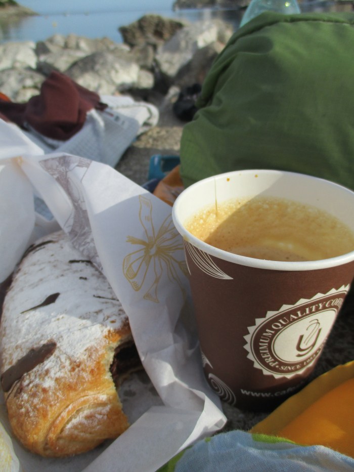 Es konnte nur besser werden. Frühstück am Strand, das war der Plan. Port de Pollença erwachte gerade erst, auf der Promenade rückten Restaurantbesitzer die Stühle zurecht, ein paar sommerlich bekleidete Touristen spazierten mit zeitungen und Brötchentüten am Wasser entlang. Eine Bank am Strand war wie für uns gemacht. Nachdem wir im seichten Wasser der Bucht abgetaucht waren und damit unser Waschdefizit beglichen hatten, standen alle Zeichen auf Kaffee. Nach der Entbehrung der Nacht und keinem wirklichen Abendessen musste nun ein Schokocroissant und ein Espresso her!