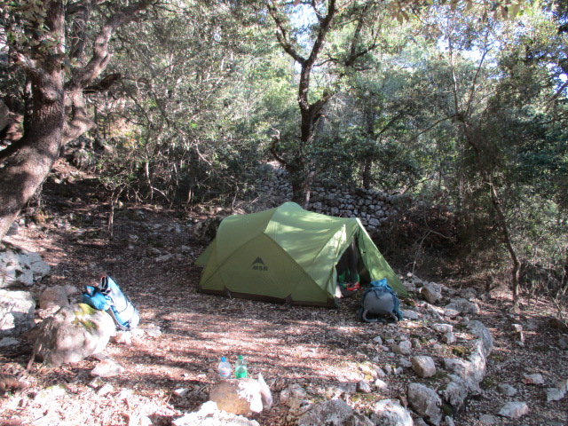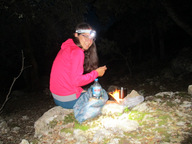 Ronja übersteht die Busfahrt so mäßig. Irgendwann kommt sie matt wieder hinter einem Gebüsch hervor und möchte in diesem Moment wirklich nie wieder in so ein Gefährt einsteigen. Die Serpentinen waren tatsächlich brutal, der Busfahrer im Bremsen und Anfahren selten unsensibel. Ich kaufe Salzstangen und Cola, Erstversorgung für gebeutelte Bustouristinnen. Es wird langsam dunkler und wir müssen uns überlegen, wo wir schlafen wollen. Auf der Karte führt hinter der Bushaltestelle ein Weg ins Grüne. Wir laufen los, erst asphaltierte gassen mit Steinmauern, dann Gestrüpp, drehen wieder um, nehmen eine andere abzweigung, der Weg wird zu einem Trail, steigt an und führt uns in bewaldete Gefilde. Links Bäume, rechts trockene Weide hinter einer Steinmauer. Irgendwoher nimmt mein Körper an diesem Abend einen ganzen Batzen Energie und ich sprinte vor, um uns ein Plätzchen zu suchen. Wieder finde ich, wie schon bei Lluc, eine Moosplattform. Wir errichten unser Zelt. Als wir gerade fertig sind stehen zwei junge Leute vor uns, ein Pärchen aus Skandinavien. Sie schauen uns ein bisschen verwirrt an – das war doch ihr Platz. Ihre Rucksäcke liegen versteckt hinter Steinen, sie waren nur kurz in die Stadt hinabgestiegen. Wir verrücken also unser Zelt und teilen uns die Plattform. Mittlerweile ist es stockdunkel. Ronja kocht noch ein bisschen Brühe im Licht der Stirnlampe. Um uns herum nur Schwärze und Waldgeräusche. Wieder mal ein ganz anderer Schlafplatz. Wieder mal ganz nahm am Busen der Natur. unvorstellbar, dass morgen schon der letzte Tag anbricht.