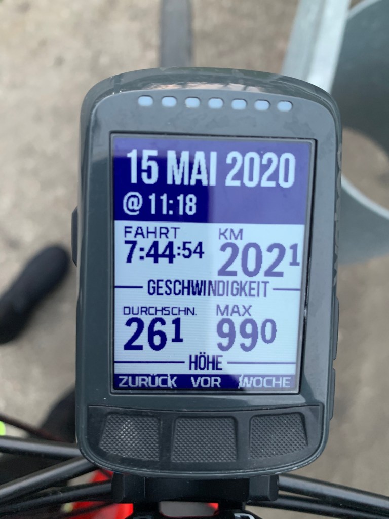 Es sind gar nicht die Oberschenkel, die haben noch Kraft. Es ist eine Allianz aus Po, Rücken und Schultern, die gemeinsam protestiert. Auf den letzten 30 strecke ich mich alle zwei Minuten aus dem Sattel, ungemütliches finish. Erst bei 10 beginnt die Euphorie. Und dann der Dämpfer: 5km vor dem Ziel checke ich nochmal die Karte. Ja, ich weiß, dass es meinen Zielort zweimal gibt – in Schleswig-Holstein und in Meck-Pomm. Aber, dass es ihn noch ein drittes Mal gibt, nochmal in MeckPomm, um die 20 km entfernt von seinem bundeslandselben Namensvetter – wow! Da stehe ich nun, 202km auf der Uhr, und noch 20km weg vom Ziel, das mir so nah schien. Einrollen wollte ich, mit Fahnen und Trompeten. Unter die Dusche und an den Esstisch plumpsen. Pustekuchen! Aber ich habe das beste Begleitfahrzeug der Welt und werde abgeholt, die 20 extra bleiben mir erspart. Es dämmert auch schon. Wenig später plumpse ich erstmal dankbar in den Sitz des VW Busses und mit ein bisschen Verspätung folgt auch die Dusche und der Grillabend. Eastbound200 (202 !), die ersten 200 am Stück, geschafft!