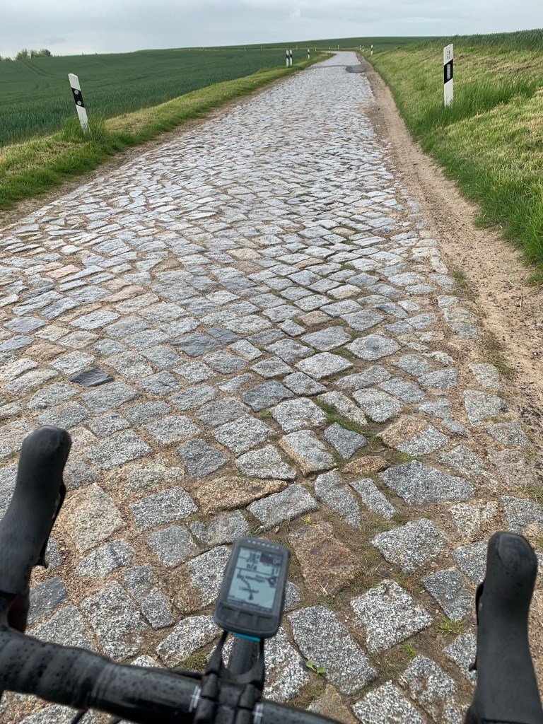150km und ich sage mir: Komm, läppische 50km, eine kurze Sonntagsausfahrt. Aber so viel Lust habe ich nicht mehr. Ich verspreche mir den letzten schokoladenummantelten Mandelriegel für die letzten 30km. Die Landschaft zieht vorbei, unbekannte Ortsnamen. Nochmal ein Schauer. Und zwei Mini-Shetlandponies in einem Mini-Vorgarten. Bei Kilometer 170 habe ich die Strecke von Paris- Roubaix erreicht. Vor mir erstreckt sich eine Pflasterlandschaft grober Unebenheiten. Heiliger Bimbam. Kack Navi. Grober Unfug, wer braucht sowas? Erschütterungen bis ins Mark, mein armes Fahrrad. Und den Platten sehe ich bereits vor mir. Nach einem knappen Kilometer ist der Spaß vorbei. Nie habe ich eine glatt asphaltierte Straße mehr zu schätzen gewusst. Den Riegel habe ich verdient. Kurze Pause.