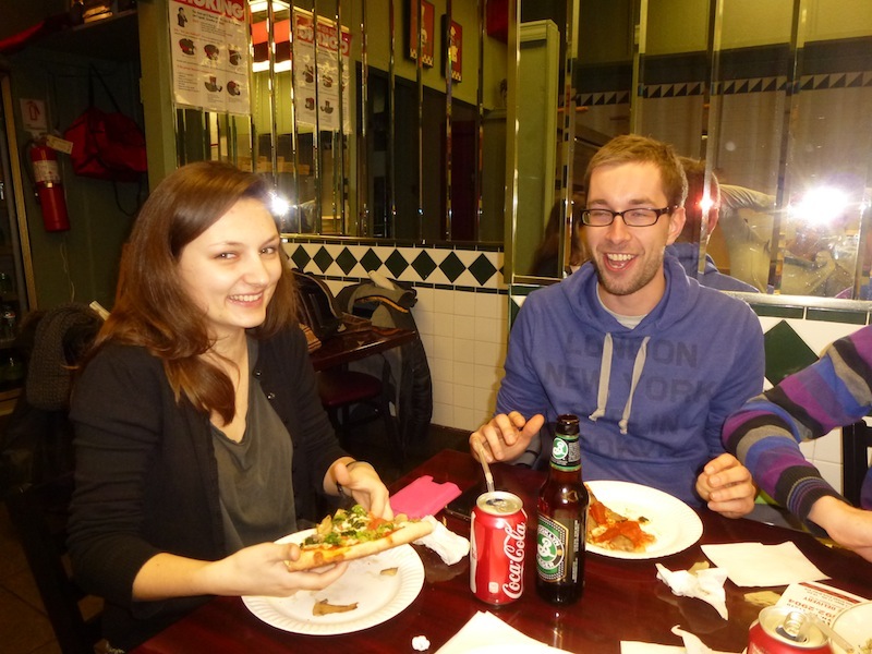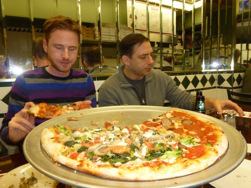Zurück steigt Matti nicht in Harlem aus, denn wir sind noch zum Pizzaessen eingeladen. In der hauseigenen Pizzaria von Mike, dem Hausmeister des Goethe Instituts. Für diese Einladung nehmen wir einige Streckenkilometer Subway auf uns – der Laden liegt fast bei Coney Island. Aber das lohnt sich! Die Eggplant-Parmigiana Pizza ist grandios, genauso die Knobibrötchen und überhaupt ist eigentlich alles delicious. Außerdem ist die Atmosphäre so entspannt und gelassen wie man es sich nur für einen Sonntag Abend nach einem kalten Zooausflug wünschen kann. Schade nur, dass wir noch wieder zurückfahren müssen. Danke Mike!