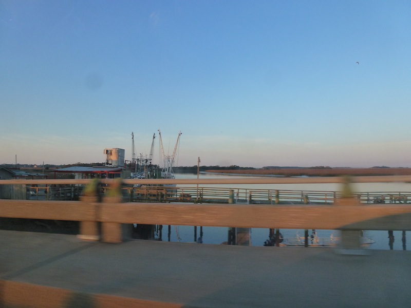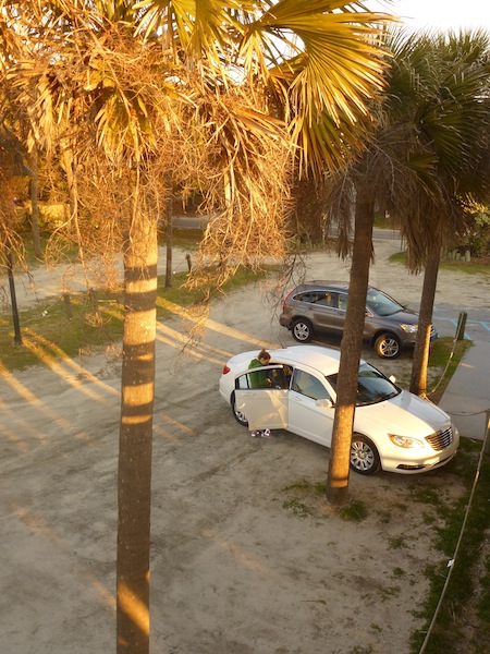 Weiter gehts Richtung Savannah. Ich habe mich darauf verlegt, die Blogeinträge auf dem Beifahrersitz zu schreiben. Gleichzeitig ist der Laptop via Kabel ins autoradio eingestöpselt und wir haben die ganze Palette der 3567 Songs zur Auswahl. Das ist jetzt ein richtiger Roadtrip. Obwohl wir zwischendurch immer mal wieder auf das Radio ausweichen, weil es hier so unglaublich gute radio stations gibt. Aber erstmal versetzt uns good old Jack Johnson in Sommerlaune. Die Landschaft erinnert mich inzwischen an die Landstraße im Hinterland der französischen Atlantikküste im Spätsommer. Lange zweispurige Straßen, rechts und links Pinien oder Seekiefern, zumindest nadelige Vegetation. Braun und grün als dominate Farben, die Sonne lässt alles trocken, aber wunderbar nach Sommer aussehen. Und duften. Die Wärme schmeckt nach kurzen Klamotten und Barfußlaufen. My feet on the dashboard. Aus gegebenem Anlass hören wir Passenger Seat, Death Cab for Cutie. „With my feet on the dash, the world doesn’t matter“. Auf der Straße haben wir schon zwei Hamburg Süd Container gespottet. Und Karo entdeckt ihre biologische Ader auf diesem Trip. Seit die Landschaft südlicher wird und rechts und links immer mehr Flussarme und Seen auftauchen, ist sie auf der Suche nach Krokodilen. Und dann kommen auch so Kommentare wie „Hm, meinst du im Turtle Creek gibt es Schildkröten?“ Wunderbar! Savannah nennt sich selbst „Schönste Stadt der USA“. Wir nehmen uns 1,5 Stunden um diese selbsternannte Perle im Bundesstaat Georgia zu erkunden. Nett und warm ist es, aber naja, wir wollen es nicht übertreiben mit dem Lob. Passt schon. Während wir Stunde um Stunde mit unseren durschschnittlich 60 mph dahin cruisen, arbeiten wir Karo eine thematisch passende Spinningstunde mit dem Titel „Durch den Osten der USA“ aus. Mit den passenden Liedern, die uns auf der Fahrt durch die Ohren und ans Herz gehen. Klopfen die Rythmen auf die Beine, treten im Geiste die Pedalen des im Stehen rasenden Rades. Geht das? Wo ist der Beat? Genial, das geht total ab! Die Meilen fliegen dahin, wir kratzen an der 1000 Meilen Marke. Und haben erst zweimal tanken müssen, $85 insgesamt bisher. Nice! Kurzes Abendessen in einer legendären Restaurantkette der Südstaaten, „Sonny’s BBQ Restaurant“. Unser Fleischbedarf für eine Woche ist gedeckt, riesige Portionen. Gut, dass wir schon gelernt haben zu teilen (vielleicht ist das die Moral von der Geschichte der riesigen Portionen in Amerika: Wir sollen teilen. Nur diesen Wink bisher keiner so richtig verstanden.) Whatever, das Essen war lecker! Wir überqueren die Grenze des Sunshine State um 18.30. Florida, check! Durchqueren die erste Stadt, Jacksonville, an der Ostküste, die wir meiden können, so der Insidertipp. Apropos: Zu unserer Staaten Liste fügen wir hiermit Georgia und Florida hinzu. Das macht insgesamt 9 bisher (für mich sogar 10, ich war ja schon in California). Unsere geographische Kompetenz hat sich, was die USA angeht, schon eindeutig verbessert, da sind wir uns einig! Ein geplatzter Reifen geht übrigens NICHT auf unsere Konto, jedoch auf das eines Lasters genau vor uns. Glück gehabt, dass niemand links neben uns fuhr. Sonst wäre das mit dem Ausweichen schwierig geworden. Kurzer Adrenalinstoß im unschuldig anmutenden, Abendlicht. Und weiter zu unserem heutigen Zielort: St. Augustine Beach, Florida, an der Atlantikküste. Morgen gibts es dann hoffentlich wieder Strand zu sehen. Jetzt müssen wir inmitten der ganzen Hotels in diesem Ferienort erstmal ein Abgeschiedenes Plätzchen finden, um unser Autozelt aufzuschlagen. Gute Nacht vom Parkplatz vorm Starbucks.