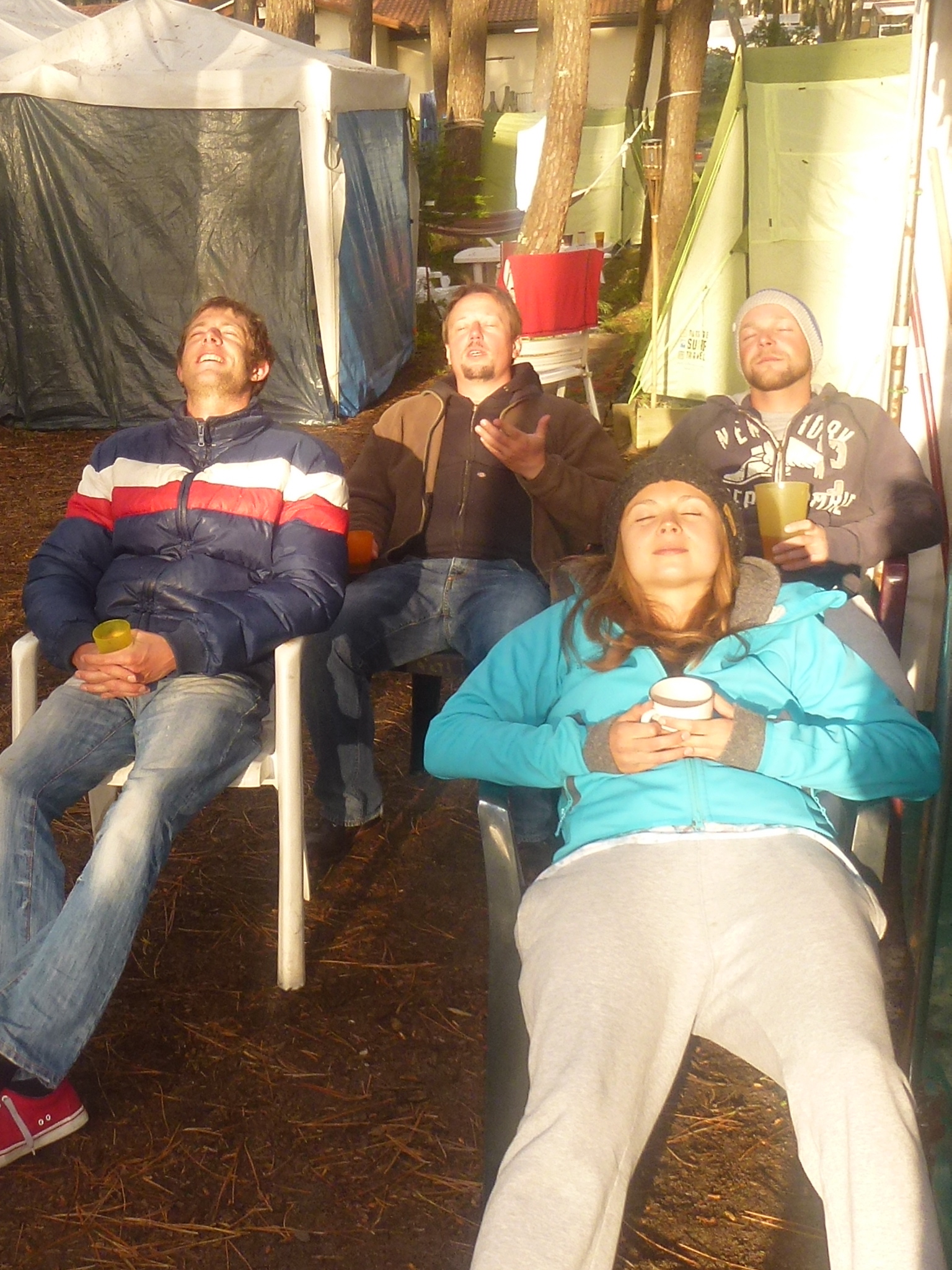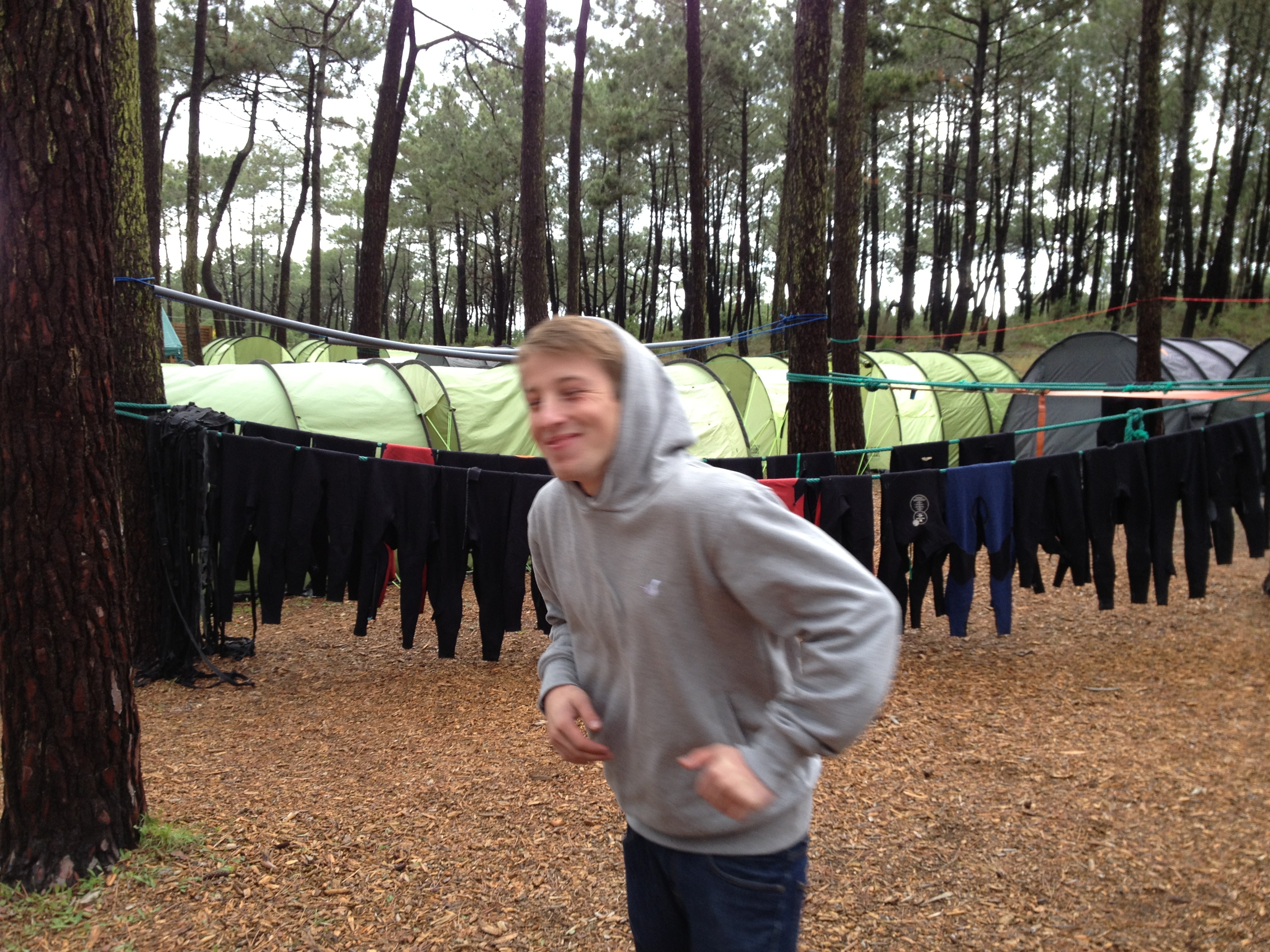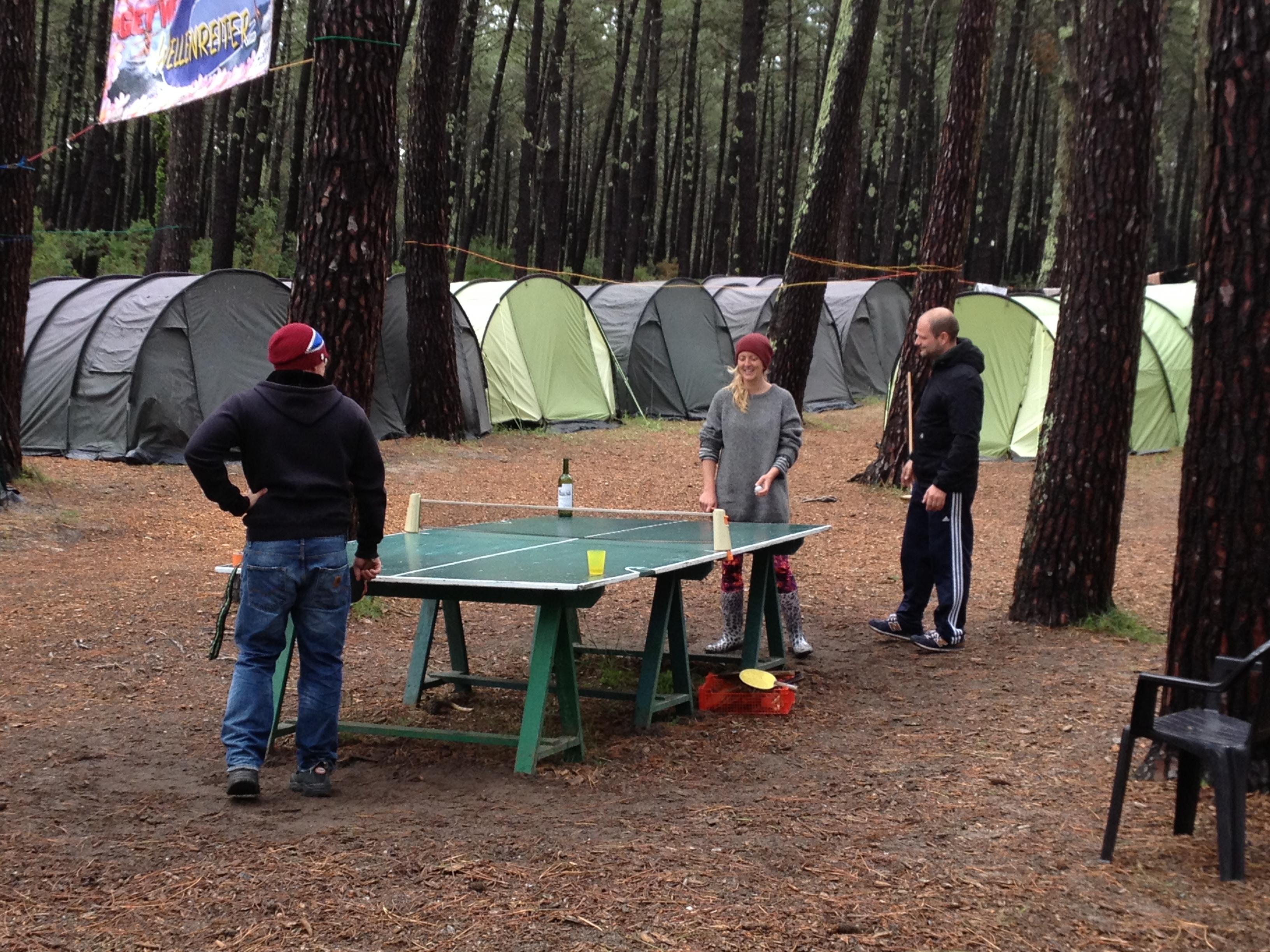 Es prasselt auf mein Zeltdach als ich aufwache. Es prasselt lauter als ich mich zum Mittagsschlaf aufs Ohr haue. Es tröpfelt noch immer als ich mich am Abend in meinen Schlafsack verkrieche. Heilige Wildsau, bald haben wir mehr Wasser vor als hinter der Düne! Wolldecken- und Strümpfe, Regenjacken und Mützen gelten derweil noch immer als obligatorisches Accessoire, es wird begonnen mit Heizlüftern für Zelte zu handeln. Ein 3’2er Neo gilt als Herausforderung, selbst die harten Kerle greifen meist auf dickeres Neopren zurück. Allerdings bauen wir alle auch gepflegt unser „Biopren“ auf bzw. an, denn die Verweildauer im Küchenzelt ist höher als die im Wasser. Soviel zum athletisch gebräunten Surferbody. Adé, du Idee des gadligen Sommerkörpers.