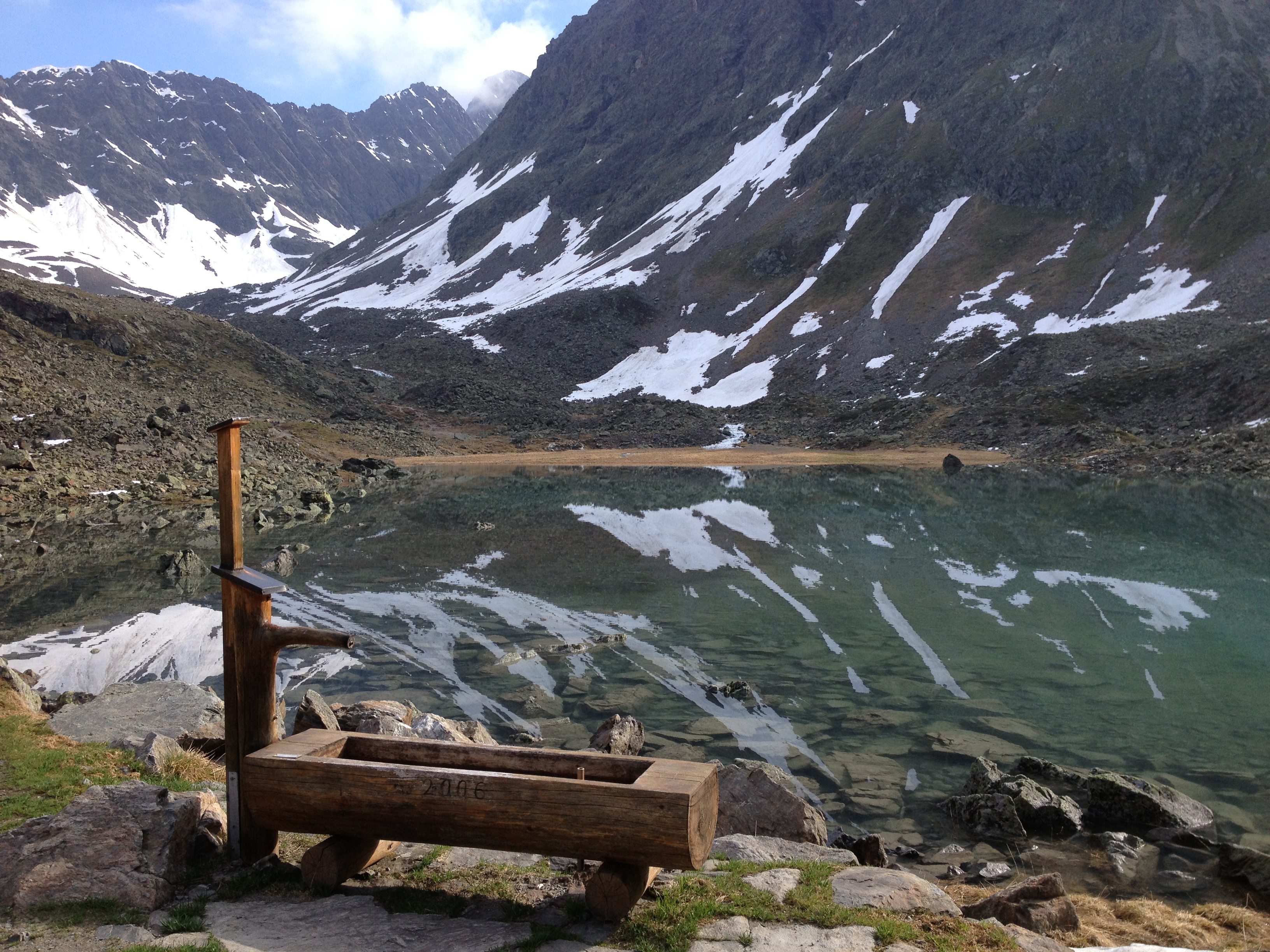 Bunte Blumen auf den Bergwiesen, der tosende Gebirgsbach stürzt das steinige Flussbett hinab, befördert den schmelzenden Schnee vom Berg. Kuhglocken läuten von den Berghängen, und das mähhhh der Geißen hallt durch das kleine Örtchen Gries. Es ist zwanzig vor sieben als ich meine Wanderstiefel schnüre und in die frische Morgenluft hinaustrete. Die ersten Höhenmeter bis nach Winnebach sind beschwerlich, die Beine noch müde und keine Berge mehr gewöhnt. Höchstens Sanddünen. Nach ein paar Metern führt der Weg in den Wald, über Stock und Stein. Überall rinnt Wasser aus den Felsen und Wiesen. Langsam verliere ich die morgendliche Schwere, springe von Fels zu Baumwurzel. Wandereuphorie kommt auf. Und das Bewusstsein wirklich hier zu sein setzt sich durch, mit einem breiten Lächeln auf dem Gesicht dem Berge zu. Bei 2000m erreiche ich mit der Baum- auch die Sonnengrenze. Ich steige gen Osten und die ersten Sonnenstrahlen, die es über das Gebirgsmassiv des Bachfallnferner schaffen, wärmen mir das Gesicht. Auch die Hänge hier oben liegen jetzt im Licht, alles strahlt und rundherum ist nur Natur zu hören. Das Geröll unter meinen Füßen knirscht, der Bach rauscht, irgendeines Vogels Geschrei hallt von den Felswänden. Immer höher geht es bis nach knapp eineinhalb Stunden die Bachfalle vor mir auftaucht: Der Wasserfall stürzt donnernd in die Tiefe und ich bleibe einen Moment stehen um den Ausblick zu genießen. Im Winter 2010 war hier alles eingefroren. Hinter dem Wasserfall kann ich das Gipfelkreuz der Ernst Riml Spitz erkennen. Ich bin meinem Ziel schon nah. Dreißig Minuten führt der Weg durch felsiges Gelände, hier oben ist mehr Stein als Alm zu sehen. Schroffe Bergmassive. Ich spüre meinen inneren Gollum in mir auf und abhüpfen…“mein Schaaaaatz“…oder vielleicht sind es doch die Orkgene, weil mich bis auf die Sonne all das hier an Mordor erinnert. Und so irgendwie auch an Neuseeland. Und dann sehe ich sie endlich: Die Winnebachseehütte. Dahinter der glasklare Winnebachsee mit Spiegelbildbergen. Das Häuschen der Materialseilbahn daneben. Alles noch da. Ich bin angekommen. Hüttenwirt Michel und Koch Ngyma warten schon. Kann losgehen.