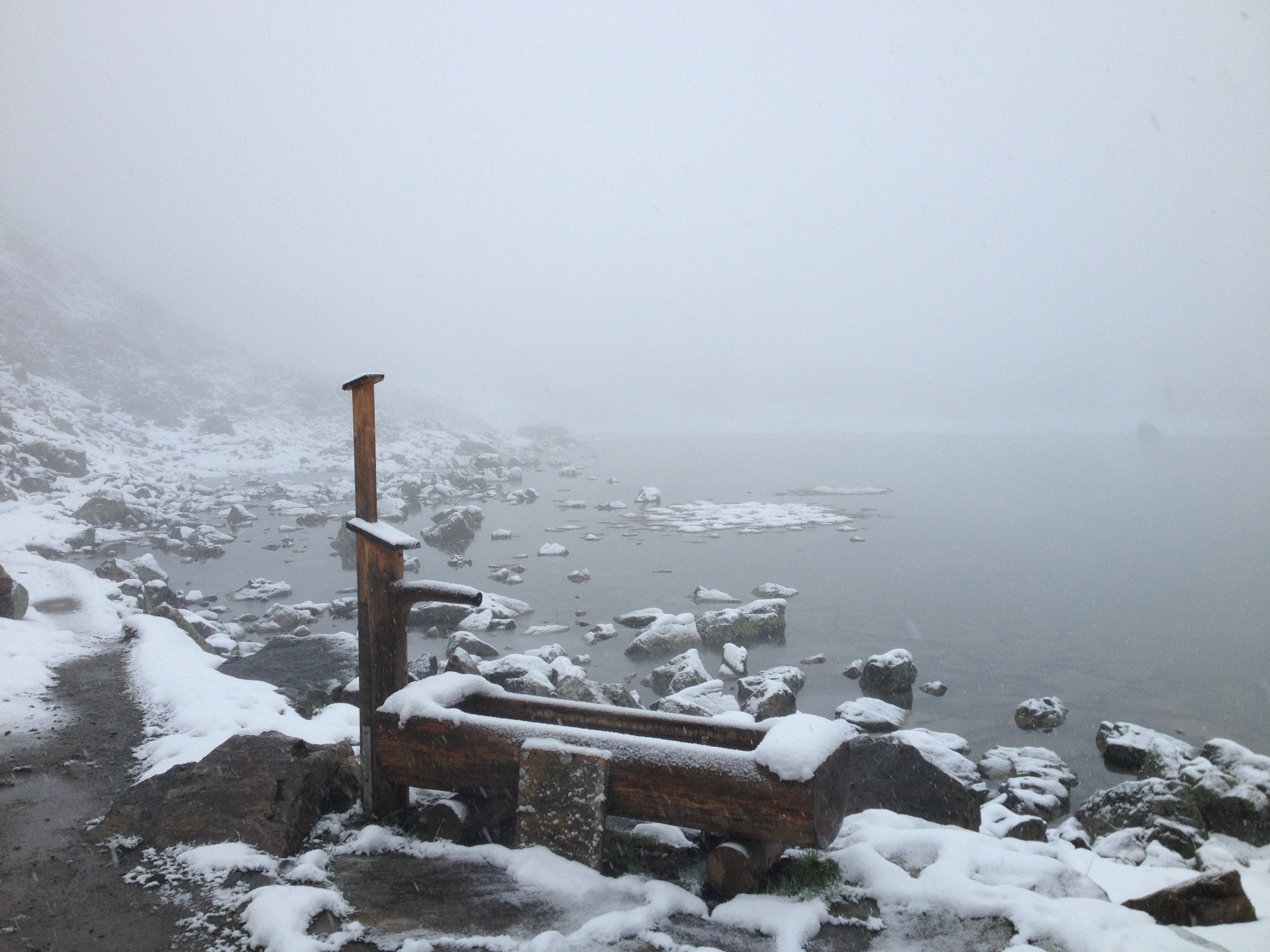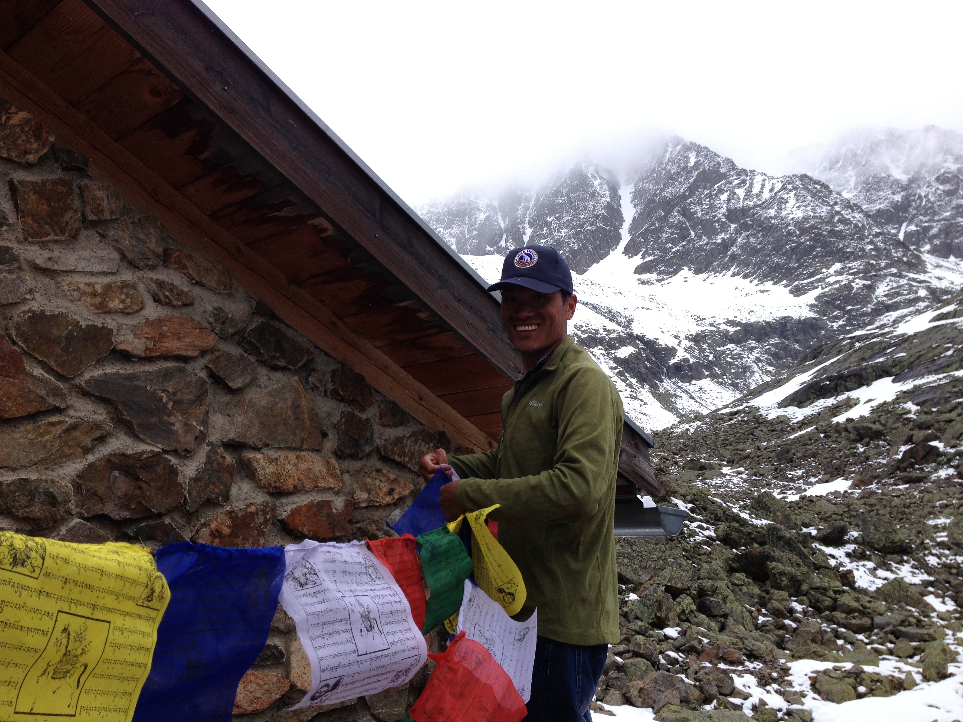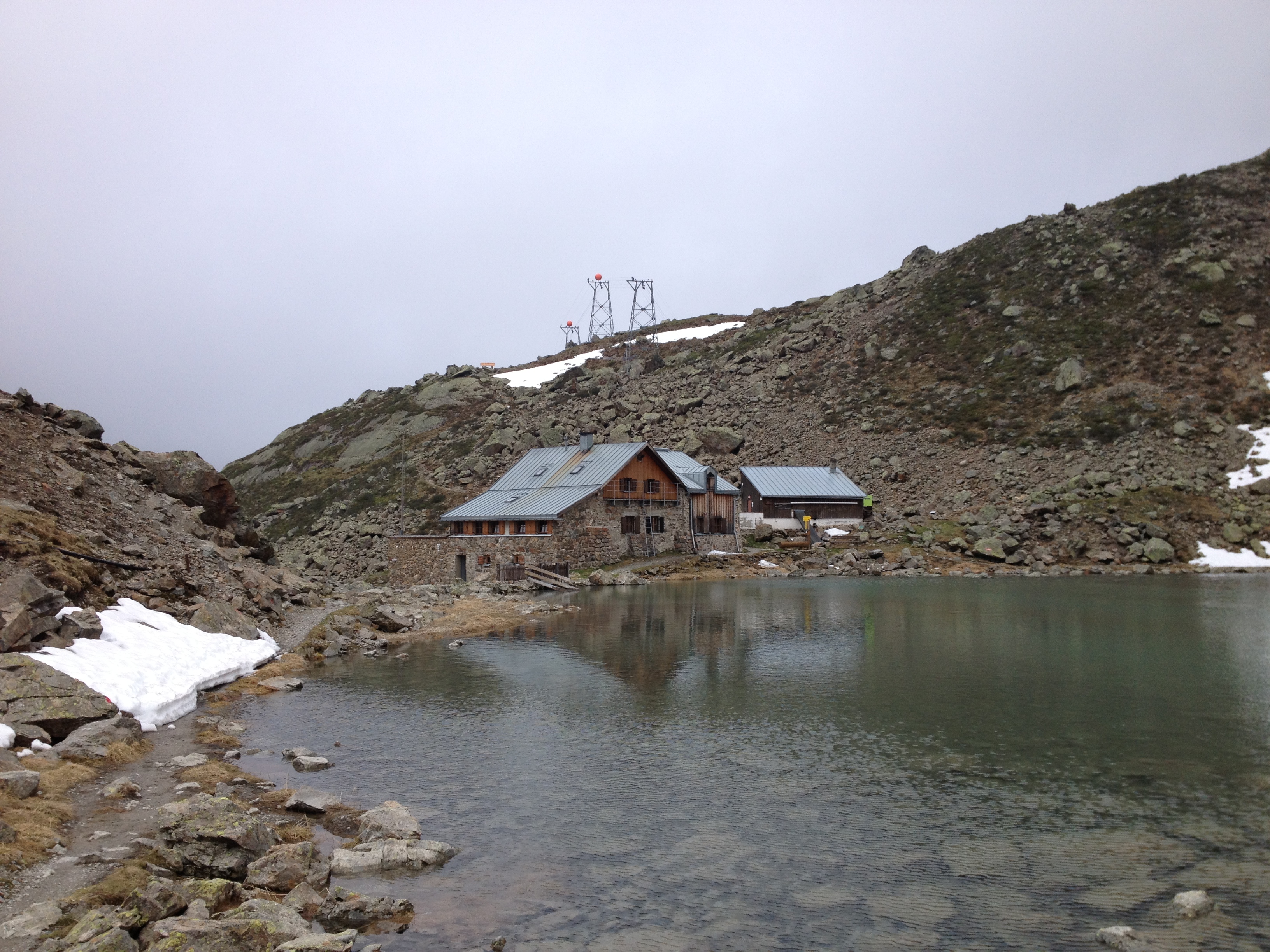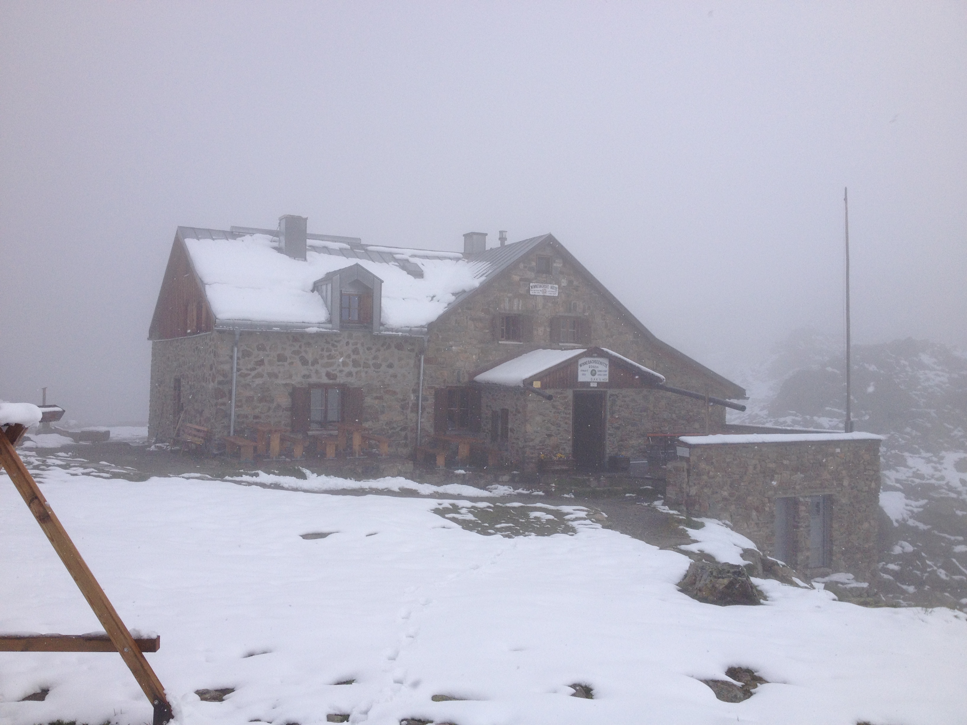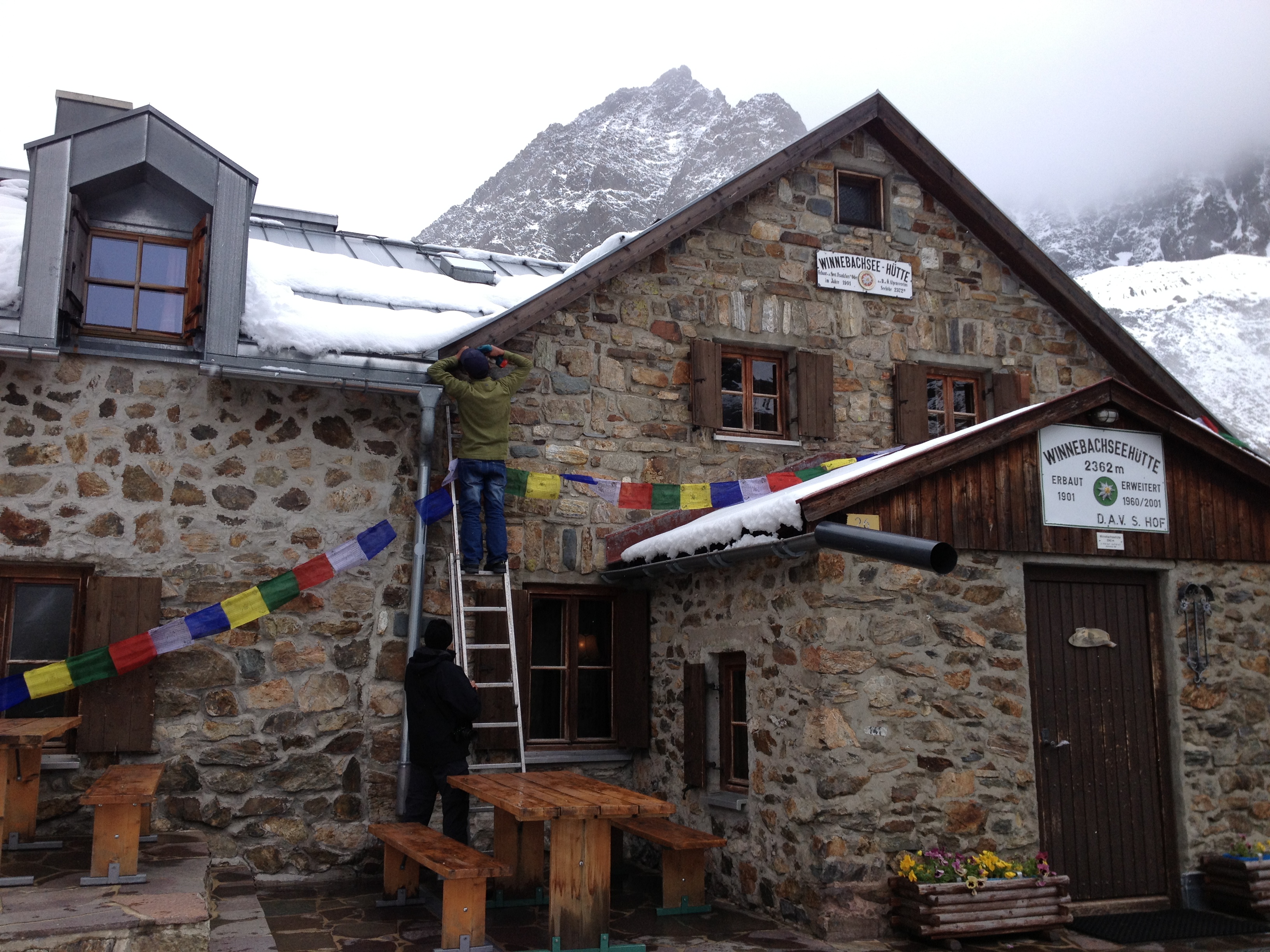 Seit ein paar Tagen schneit es ab 2000m aufwärts. Die Gipfel sind selten zu sehen, überall hängt Nebel. Wir haben auch tagsüber nur 5°C. Eigentlich wollte ich ja Sommeralmen. Zum Glück habe ich noch ein paar Wochen. Und dann kann man sich wenigstens ohne schlechtes Gewissen in der Hütte aufhalten. Viel ist allerdings noch nicht los, die Hauptsaison beginnt erst im Juli und das wechselhafte Wetter ist auch keine große Wandermotivation für die meisten Leute. Ansonsten spielt sich hier alles langsam ein. Ich gewöhne mich wieder an den lokalen ötztaler Dialekt und verstehe von Tag zu Tag mehr. Unser nepalesischer Koch Ngyma versteht kaum etwas, weder Deutsch noch Englisch, nickt aber immer und schüttelt dabei den Kopf. Und macht vor allem nie Pause. Aber nett ist er und gestern haben wir die ersten Küchenvokabeln zusammen gelernt. Nur Geduld. Seine buddhistische Gebetsfahne jedenfalls schmückt schonmal die Außenfassade der Hütte und macht den Anblick um einiges exotischer. Reisegedanken. Nepal wär ja schonmal was….Ab und zu schnüre ich mal für 2 Stunden meine Wanderstiefel und erklimme die umliegenden Gipfel. Das ist irgendwie ziemlich unwirklich und ziemlich genial und ganz generell ein absoluter Traum, so ein Panorama als Vorgarten!