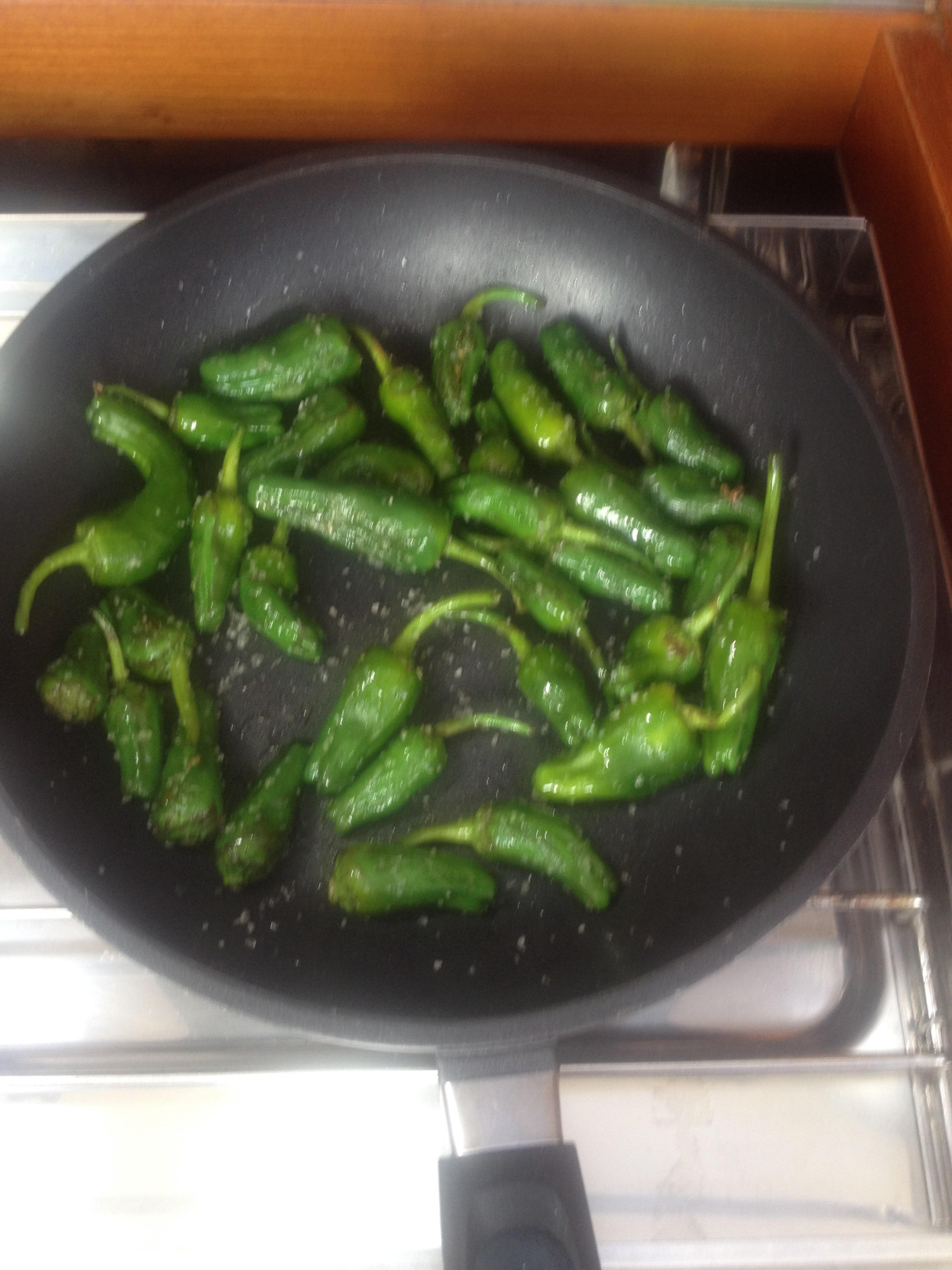 Kleine grüne pimientos de padrón schmoren salzig in der Pfanne,