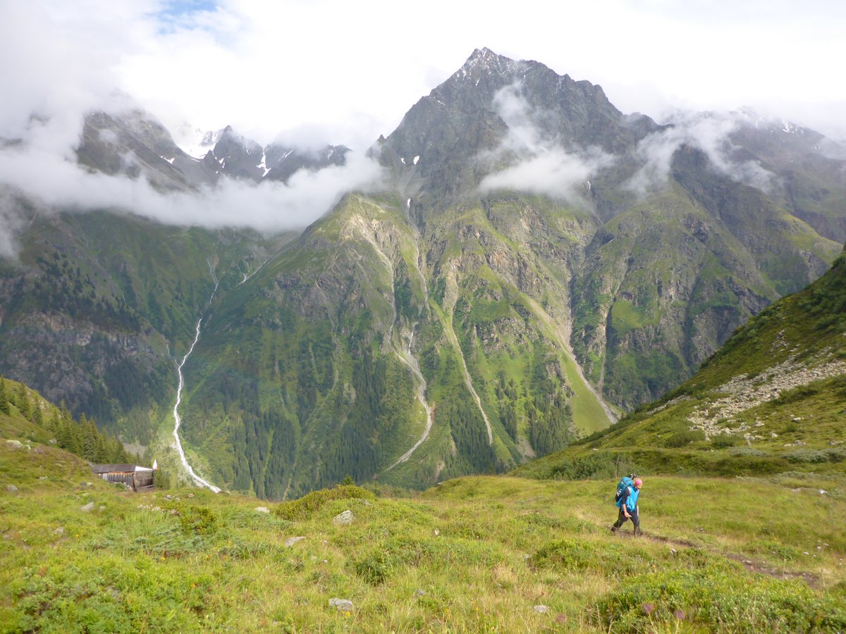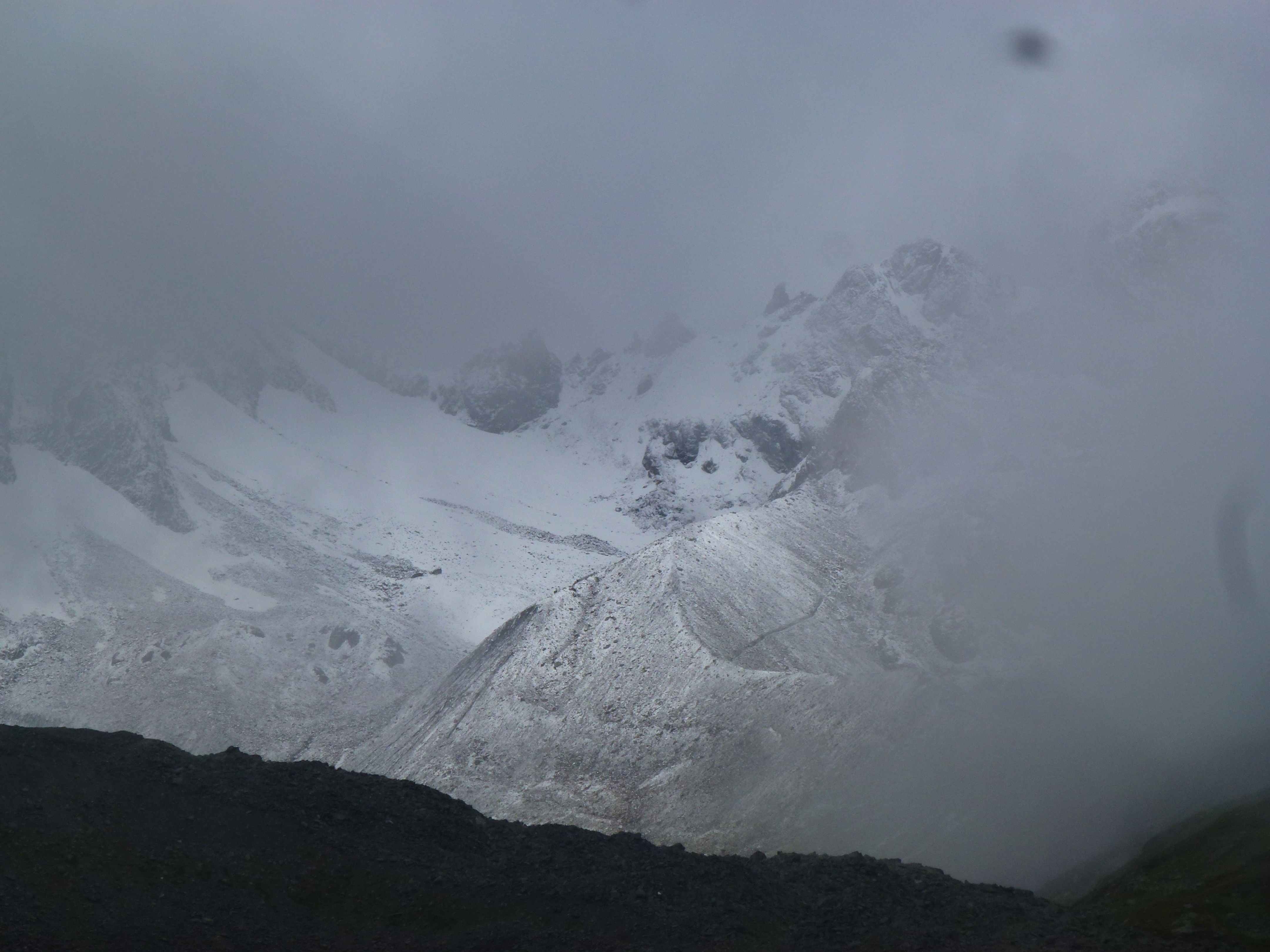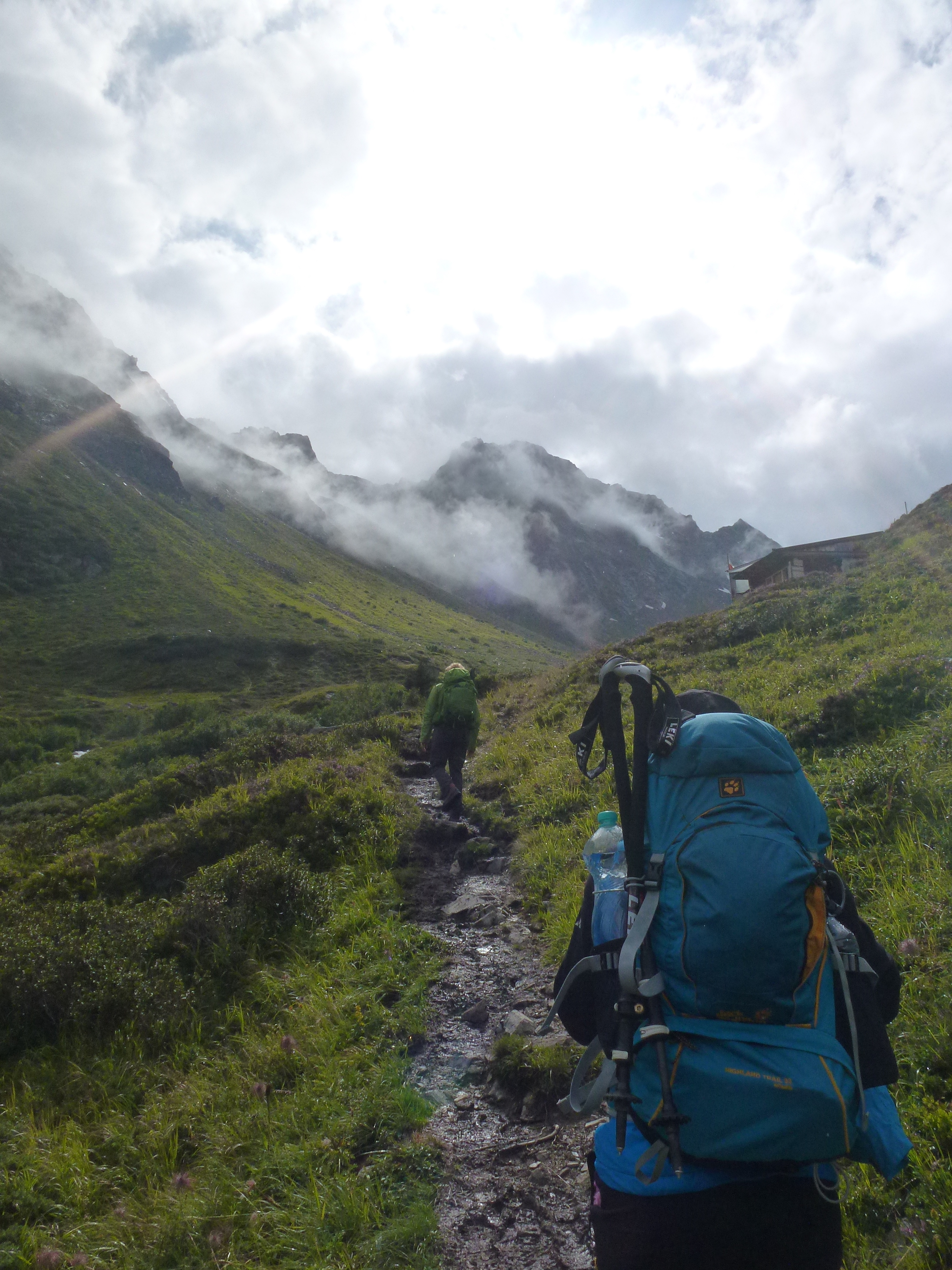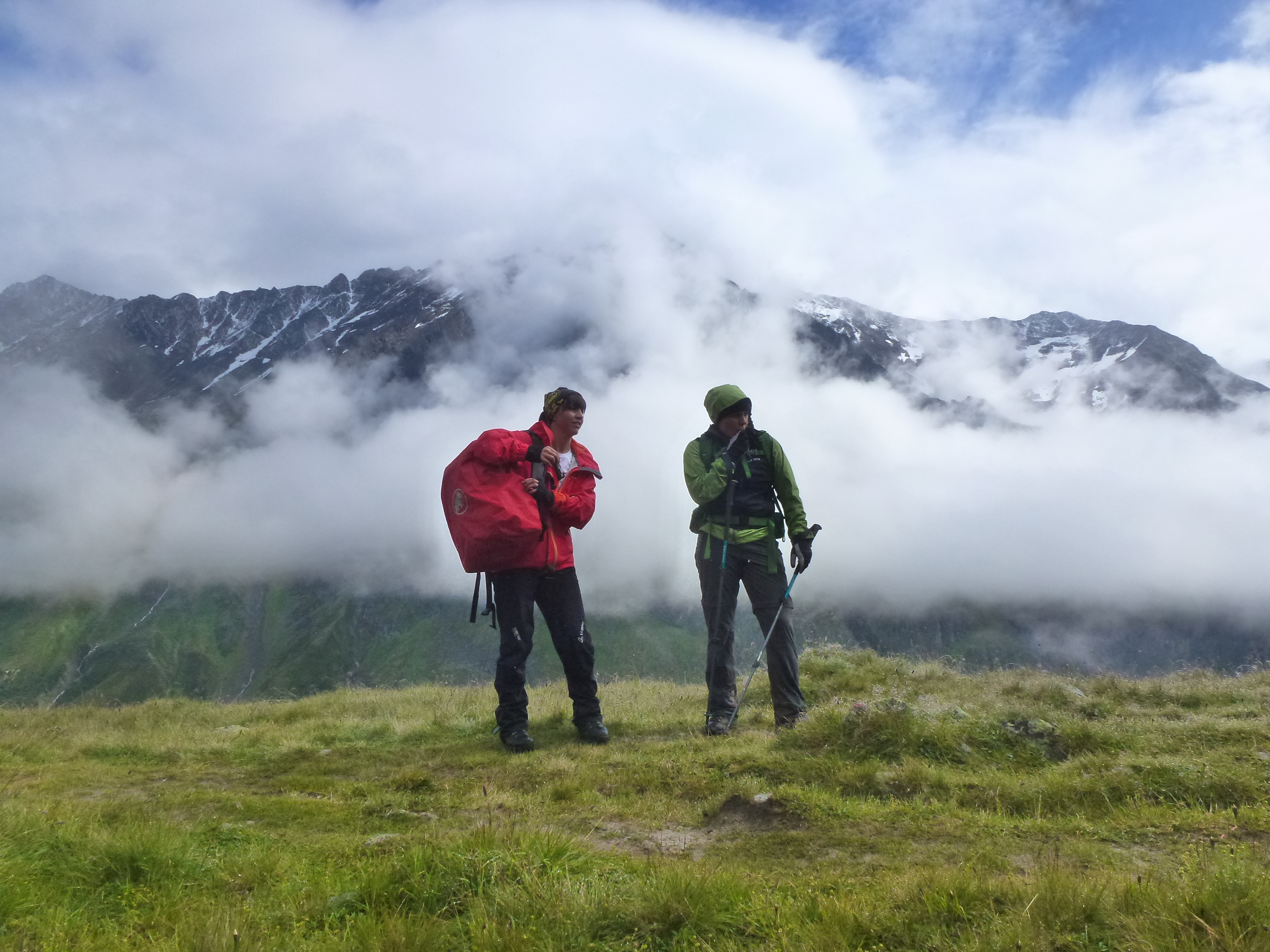In den Bergen ist man als halbwegs erfahrener Wanderer eigentlich ständig auf Schnee eingestellt, egal wo die Jahresuhr gerade steht. Trotzdem ist es immer wieder faszinierend, wenn einem dann wirklich die Flocken ins Gesicht wehen. Im August, verrückt. Wir kletterten in zackigen Serpentinen den Hang hoch, die Temperatur sackt in den Keller. Von Regen zu Sonne zu Regen zu Graupel und Nebel. So sah unser Aufstieg in den ersten 2,5 Stunden aus. Und jetzt Schnee für die finale Stunde in der uns u.a. noch ein Grat bis zur Hütte erwartet. Holla, der Bergtroll. Und ich habe auch noch meine wasserfeste Jacke auf der letzten Hütte liegengelassen. Aber wir arbeiten klamottentechnisch nach dem Schichtprinzip, das hält eine Weile trocken. Nur nicht anhalten, nicht auskühlen. Auf dem Grat zur Kaunergrathütte schaltet das Wetter noch das Gebläse ein – jetzt sind es Schneeverwehungen und auch die Funktionsjacken der Mädels halten nicht mehr so richtig warm. Wir schlottern und rutschen der Hütte entgegen, die in der Ferne erscheint. Der Wirt begrüßt uns schneefegend auf der Terasse, „Mei, die Madeln, kommts h’nein!!“. Urig, absolut gemütlich hier. Ein Abend mit Akkordeon und Volksliedern, Schnaps und Tee und Fritattensuppe wärmt uns auf. Und schickt uns im gemütlichen Lager in tiefe Träume auf 2800m. Während draußen weiter der Schnee fällt.