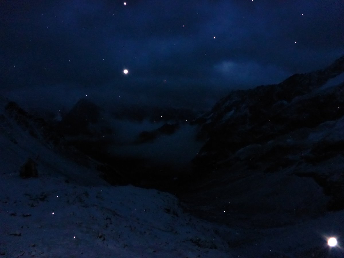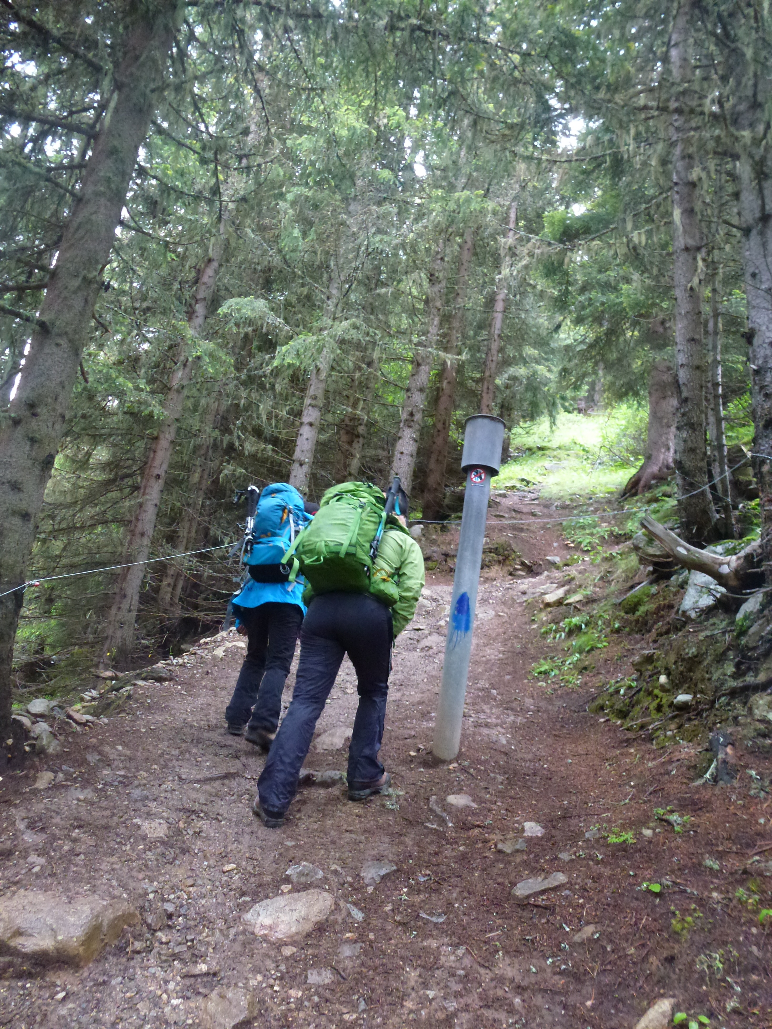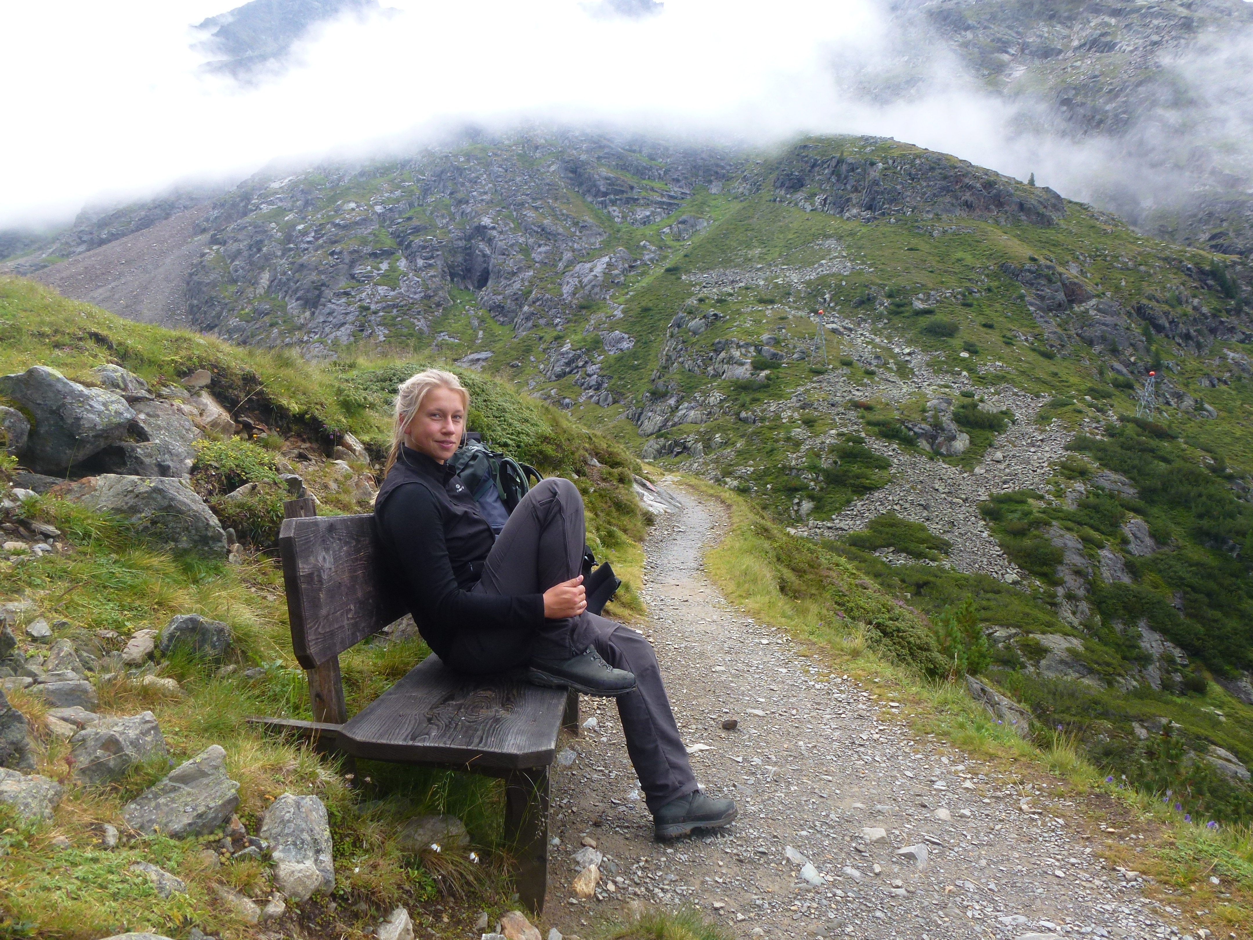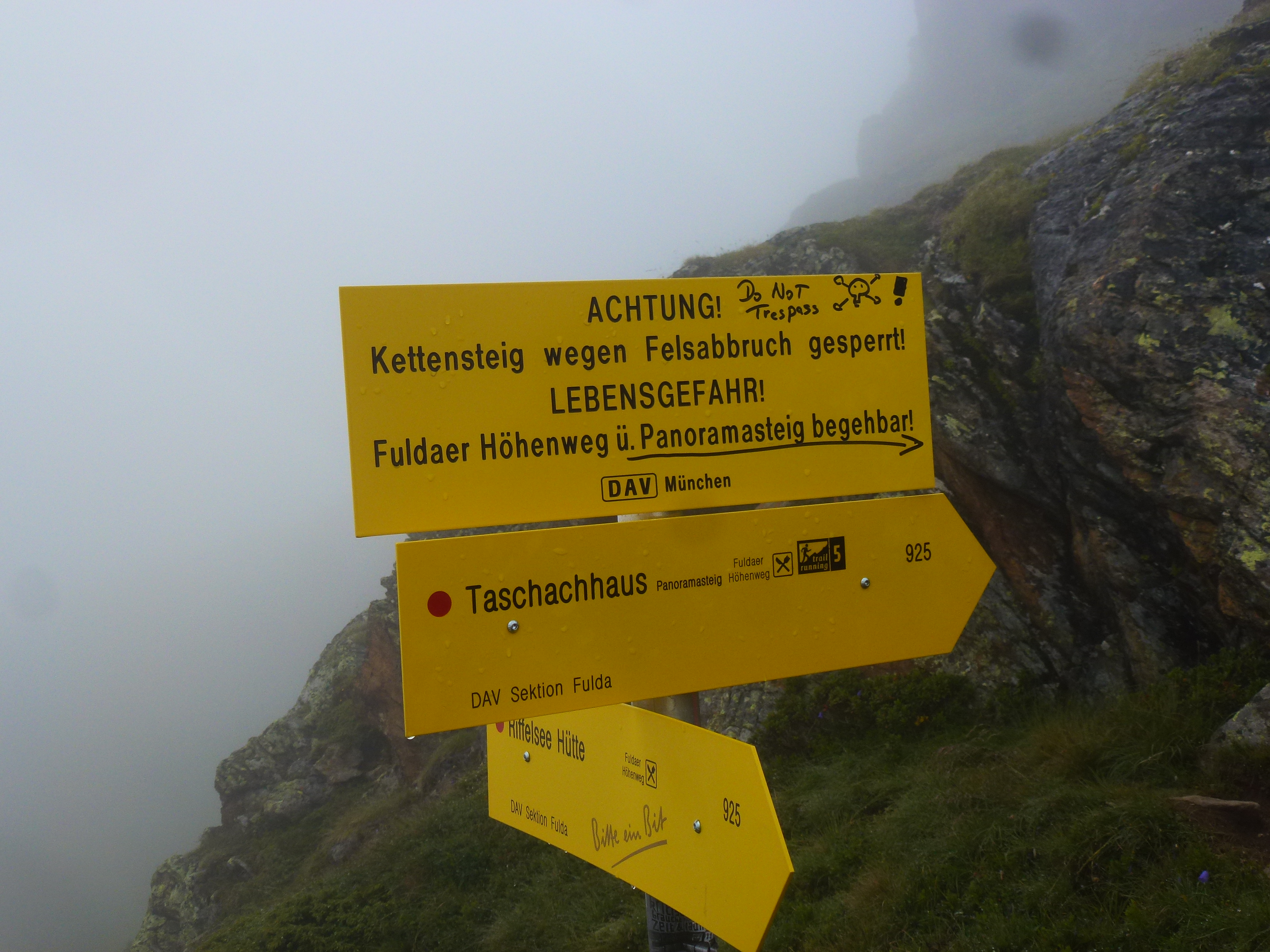 In den Bergen ist man als halbwegs erfahrener Wanderer eigentlich ständig auf Schnee eingestellt, egal wo die Jahresuhr gerade steht. Trotzdem ist es immer wieder faszinierend, wenn einem dann wirklich die Flocken ins Gesicht wehen. Im August, verrückt. Wir kletterten in zackigen Serpentinen den Hang hoch, die Temperatur sackt in den Keller. Von Regen zu Sonne zu Regen zu Graupel und Nebel. So sah unser Aufstieg in den ersten 2,5 Stunden aus. Und jetzt Schnee für die finale Stunde in der uns u.a. noch ein Grat bis zur Hütte erwartet. Holla, der Bergtroll. Und ich habe auch noch meine wasserfeste Jacke auf der letzten Hütte liegengelassen. Aber wir arbeiten klamottentechnisch nach dem Schichtprinzip, das hält eine Weile trocken. Nur nicht anhalten, nicht auskühlen. Auf dem Grat zur Kaunergrathütte schaltet das Wetter noch das Gebläse ein – jetzt sind es Schneeverwehungen und auch die Funktionsjacken der Mädels halten nicht mehr so richtig warm. Wir schlottern und rutschen der Hütte entgegen, die in der Ferne erscheint. Der Wirt begrüßt uns schneefegend auf der Terasse, „Mei, die Madeln, kommts h’nein!!“. Urig, absolut gemütlich hier. Ein Abend mit Akkordeon und Volksliedern, Schnaps und Tee und Fritattensuppe wärmt uns auf. Und schickt uns im gemütlichen Lager in tiefe Träume auf 2800m. Während draußen weiter der Schnee fällt.