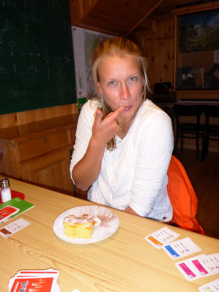 Am nächsten Tag latschen wir uns die Füße ganz schön platt, 8 Stunden über Stock und Stein. Es hat aufgehört zu schneien, ist aber ziemlich matschig. Es ist unmöglich zwischen Kuhkacke und richtigem Dreck zu unterscheiden, elegant zerfließen die Fladen und schleusen sich ins Netzwerk der Rinnsale auf den Trampelpfaden ein. Gut, dass unsere Schuhe so hoch sind. Wir latschen einfach durch und machen uns schmutzig, herrlich. Nebel ziehen, Sonne scheint, Regen tropft, Schnee grieselt. Sowas nennt man wohl wechselhaftes Wetter. Brotzeit mir selbstgemachten Müsliriegeln von Karo, Kaspressknödel und Käse. Dann gehts weiter. Die zweite Hütte ist zu groß, zu voll, zu kommerziell. Wir spielen den frust mit Monopoly Deal weg und probieren mitgebrachten Kaffee aus der Papptüte mit Filter (growerscup.com) – großartig!
