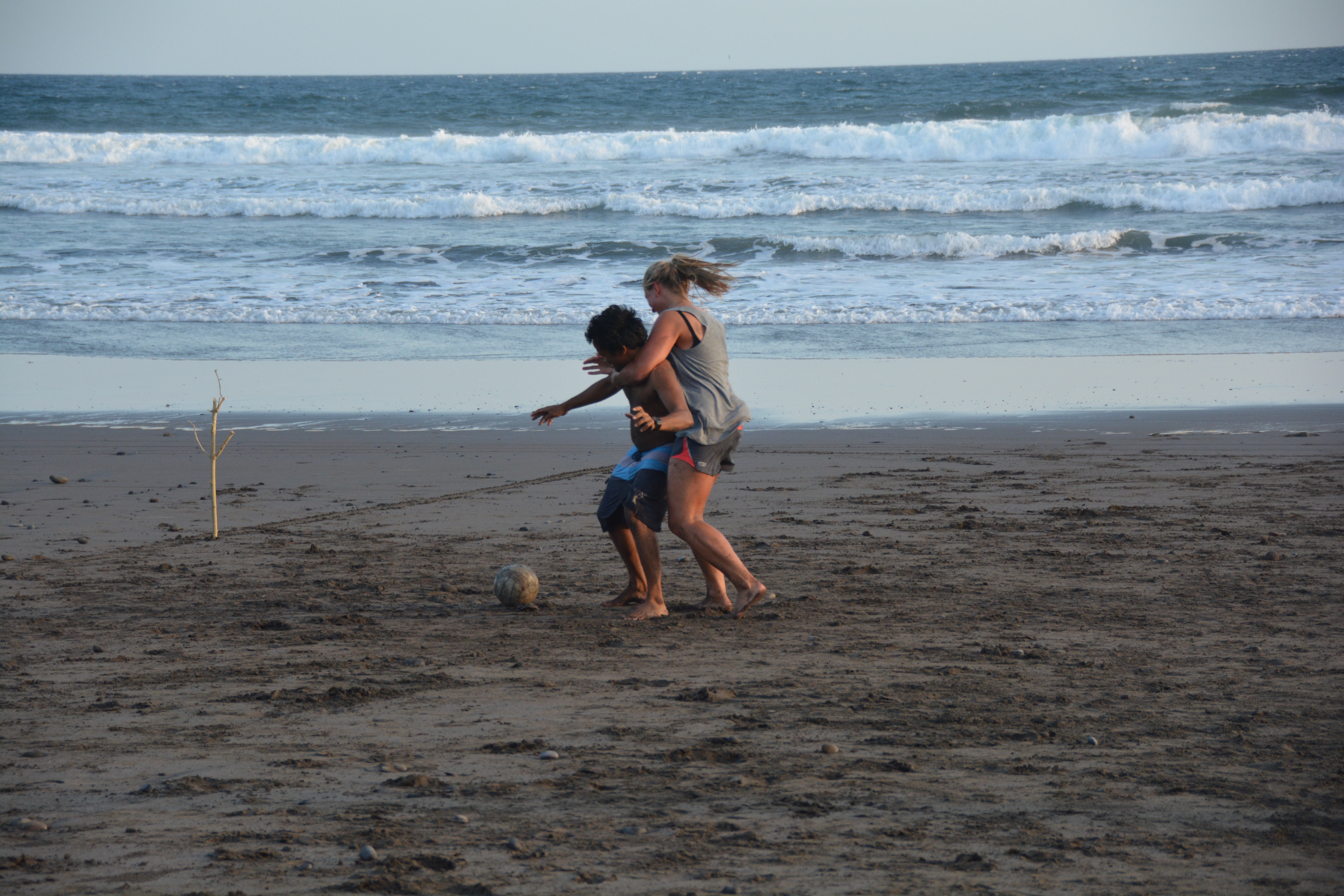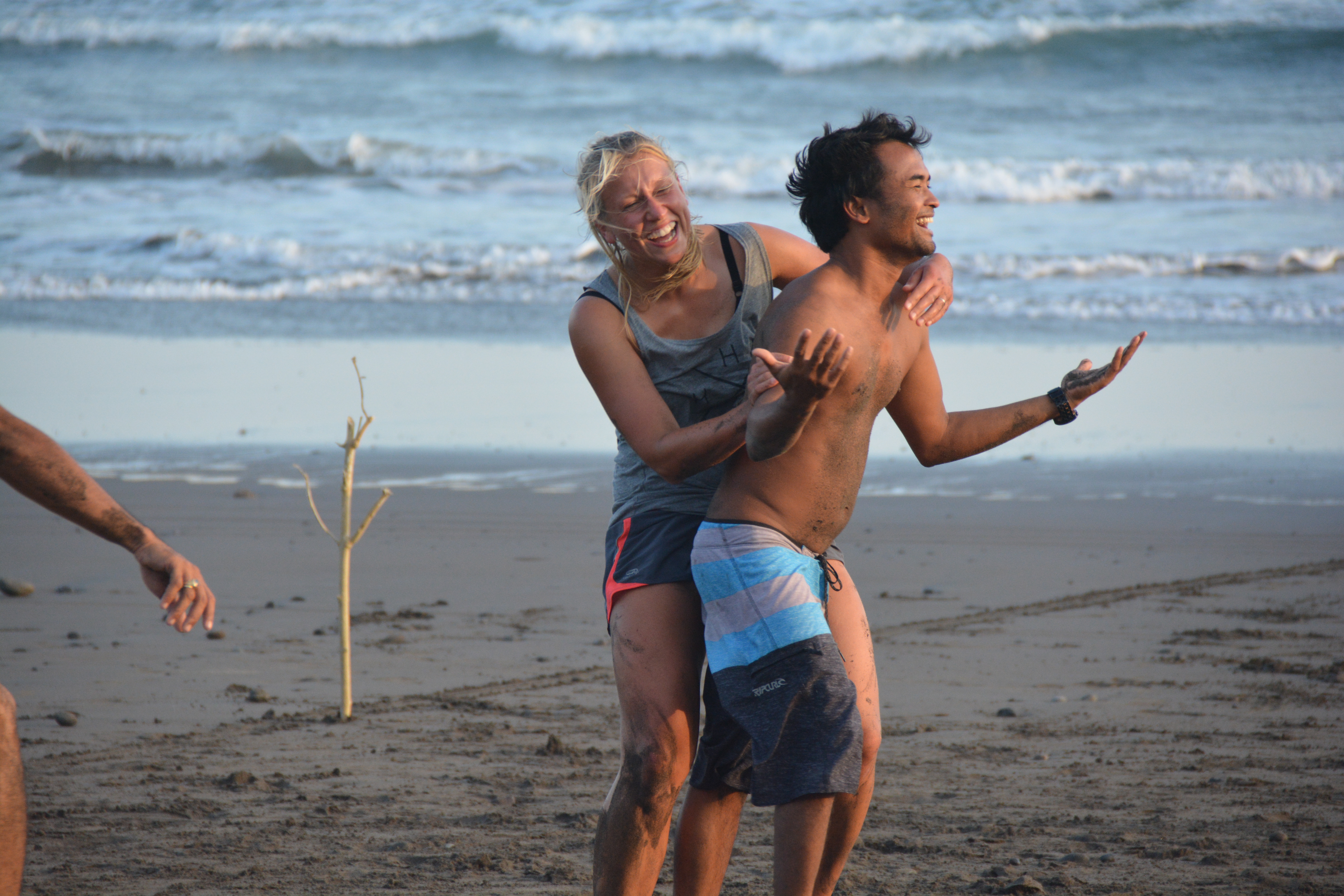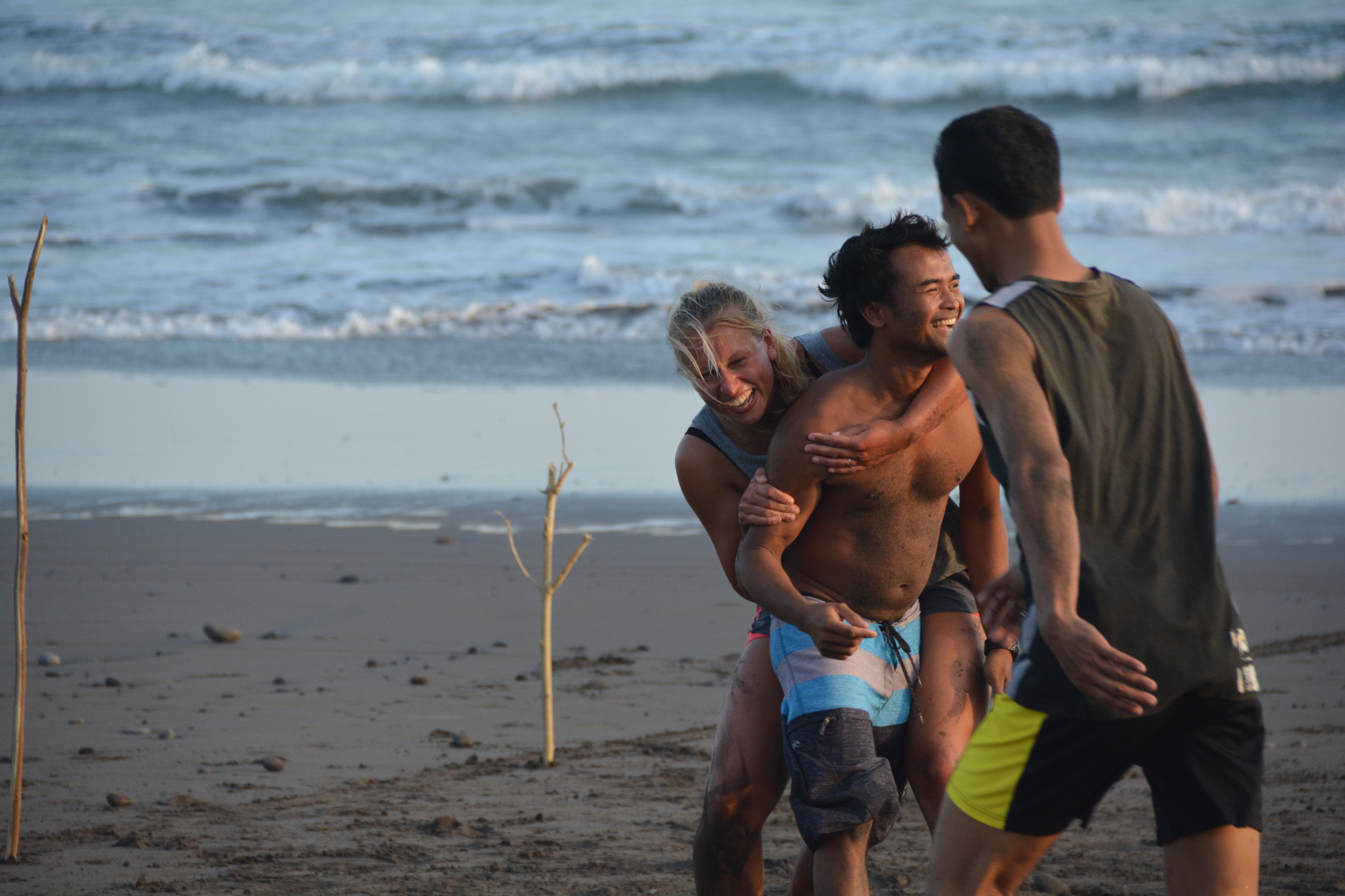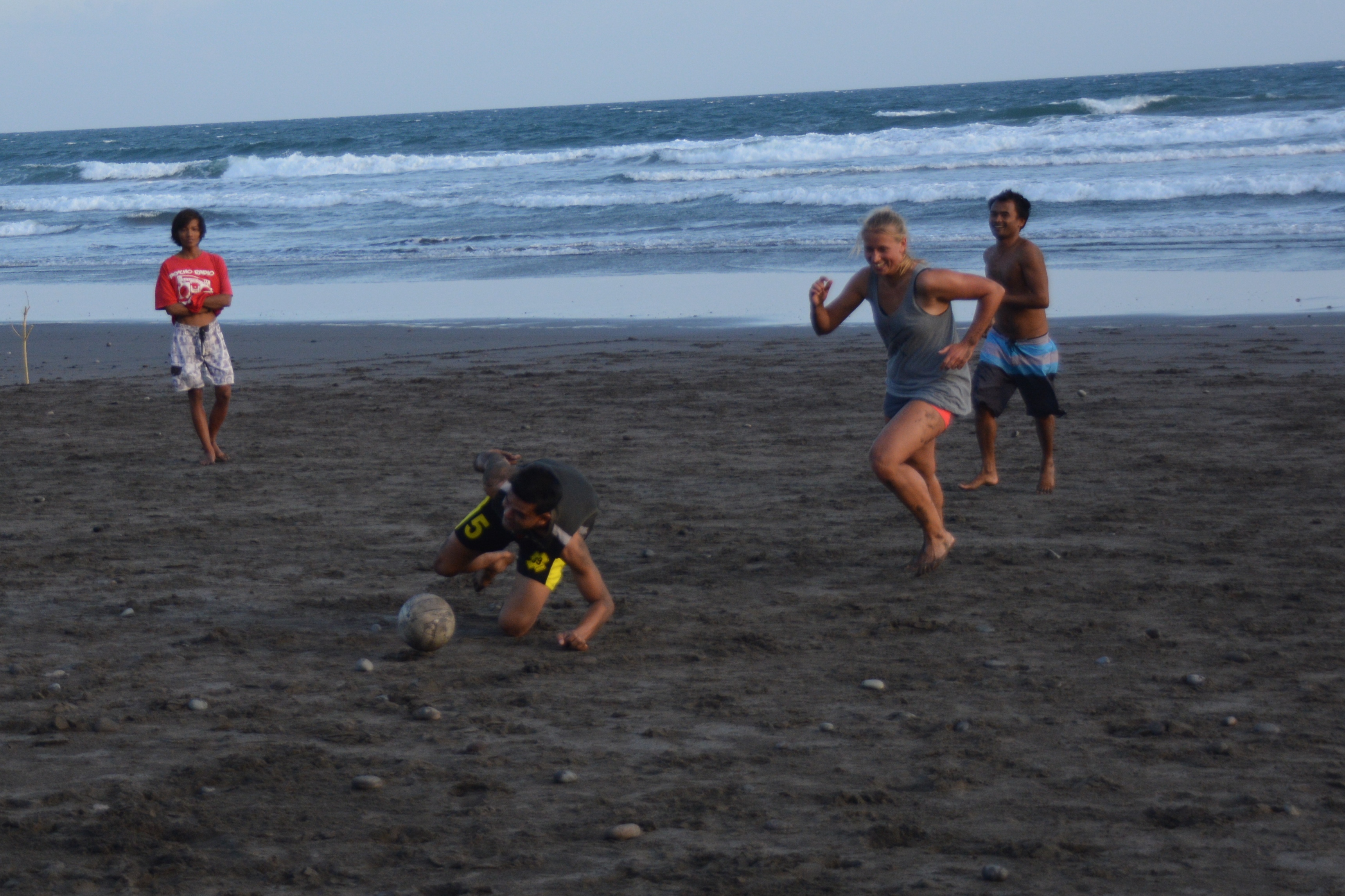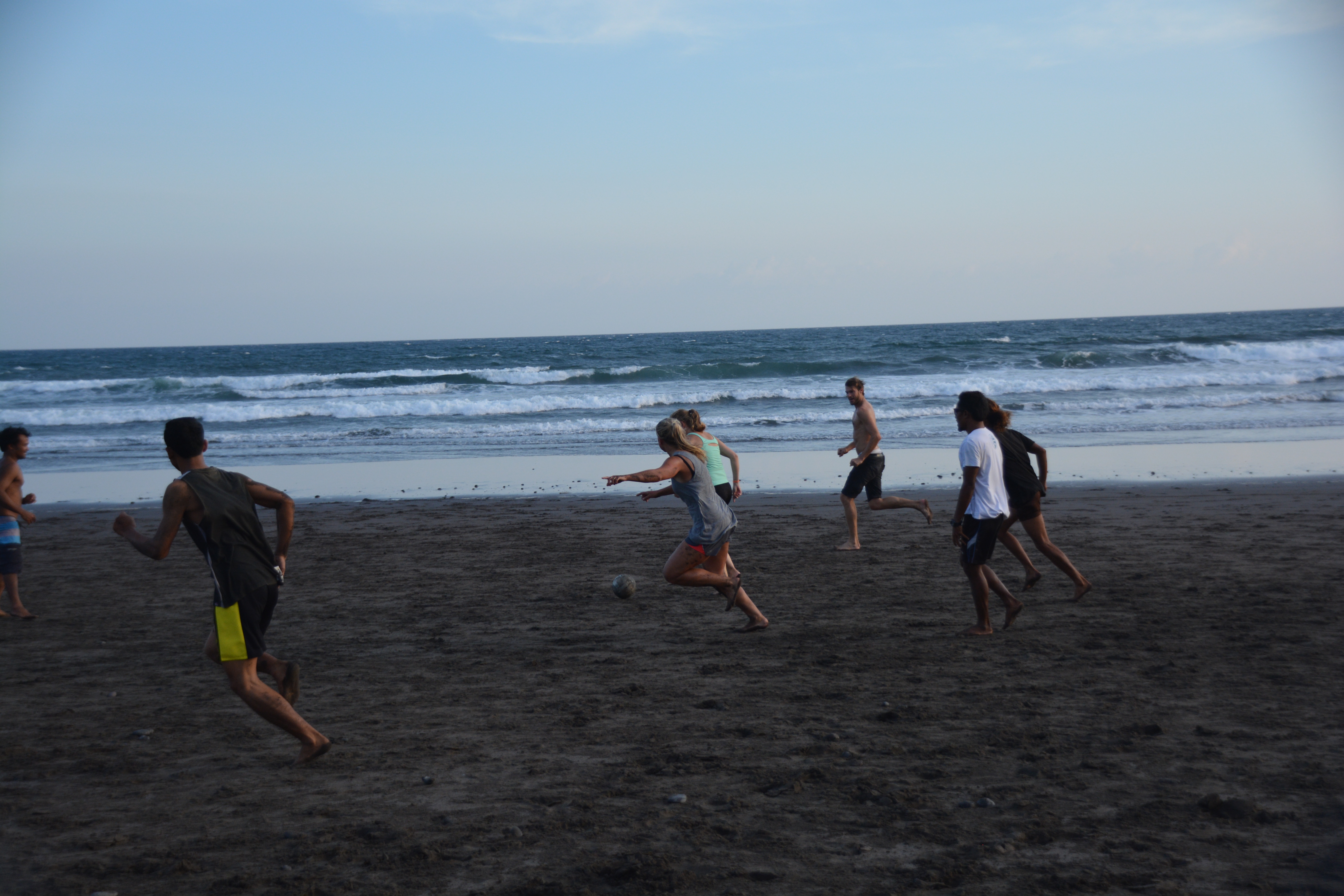 Das Eu/Bra Team (so genannt, da der Kader aus einem gebürtigen Brasilianer und sonst aus Österreichern/Schweizern/Deutschen bestand…gliedern wir die Schweiz zu diesem zwecke mal in die EU ein) fand sich selbstverständlich als erstes und pünktlich am Strand ein. Es wurden gerade Linien für ein Spielfeld gezogen und die Steine am Boden in mühsamer Kleinarbeit aus dem Feld entfernt. Von den verspätet und erst nach und nach eintreffenden Balinesen („Bali time, slowly slowly, relääääx.“ Jam karet. Gummizeit.) wurde das prompt für lächerlich erklärt und die westliche Geradlinigkeit nach Local Recht sofort wieder verbogen – Feldbegrenzungen: zur einen Seite das Meer, zur anderen Seite der tiefe dunkle Vulkansand. Zwei Tore mit Ästen gesteckt und die Steine ignoriert. Fußball Bali Style. Anpfiff.