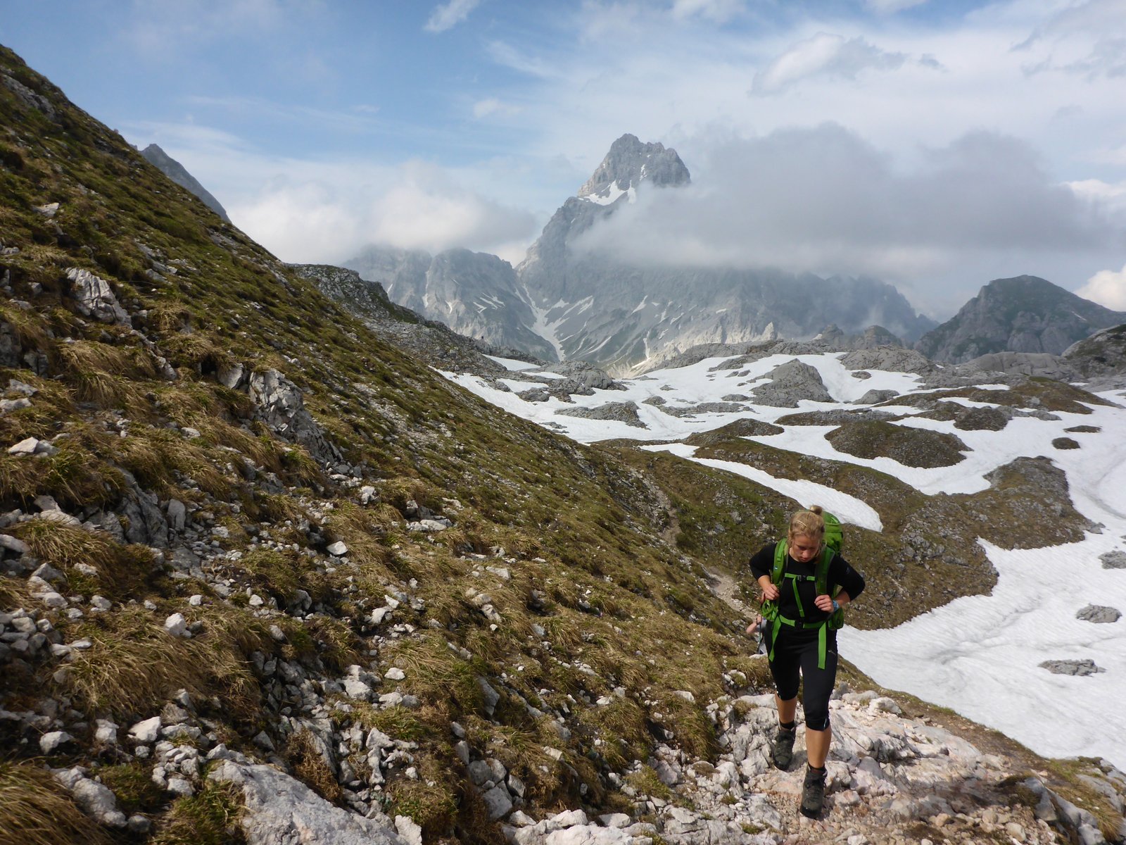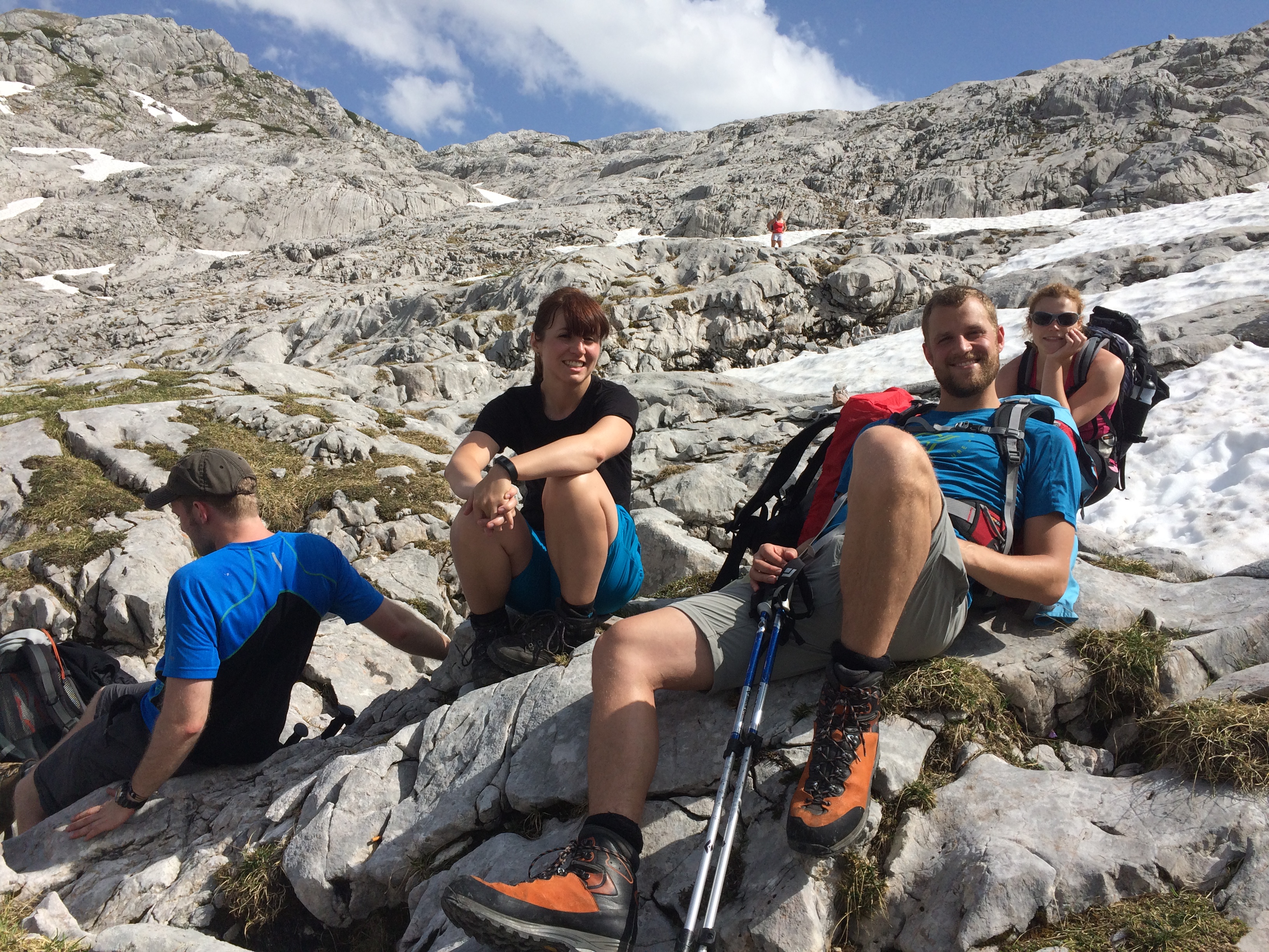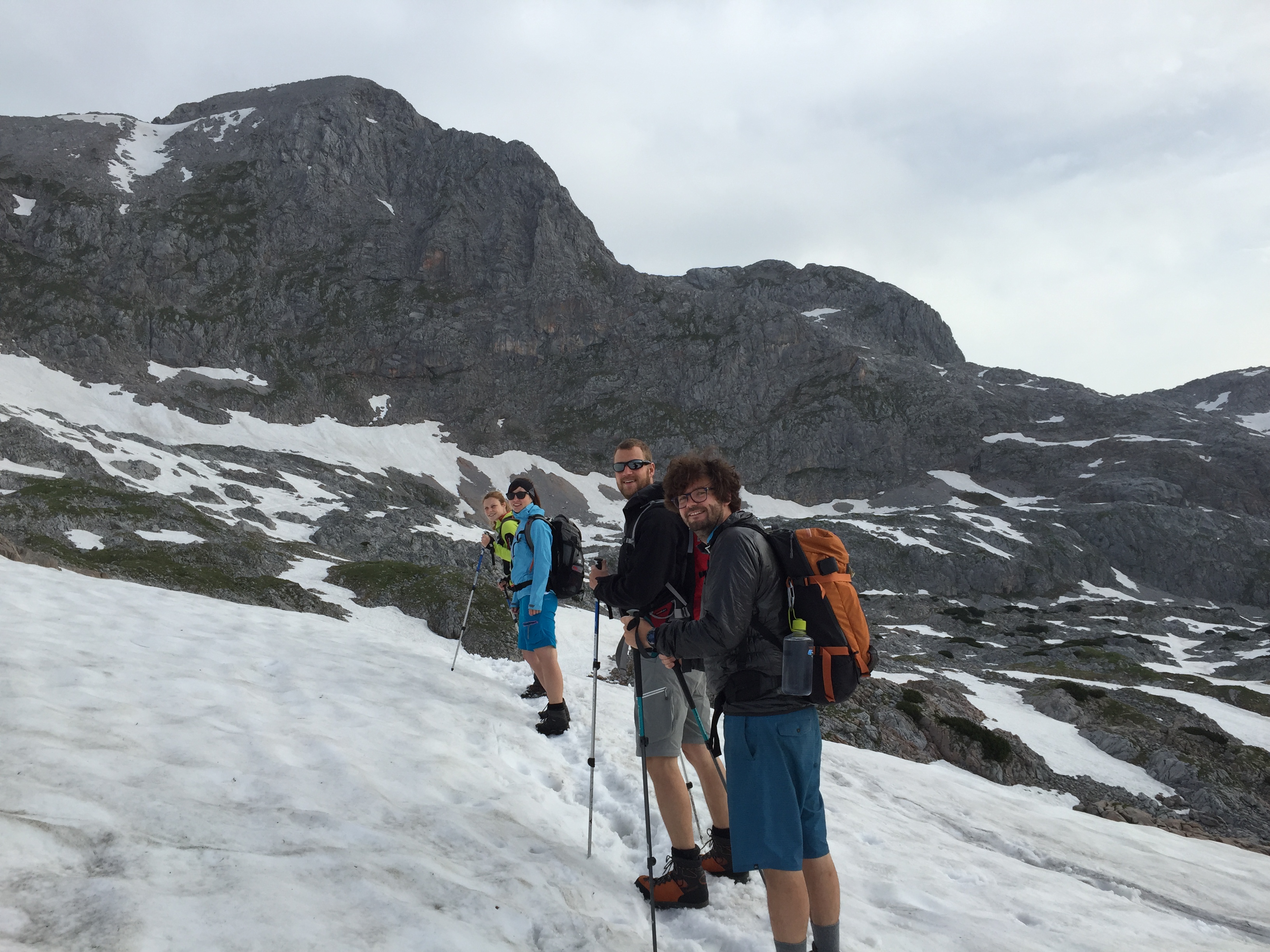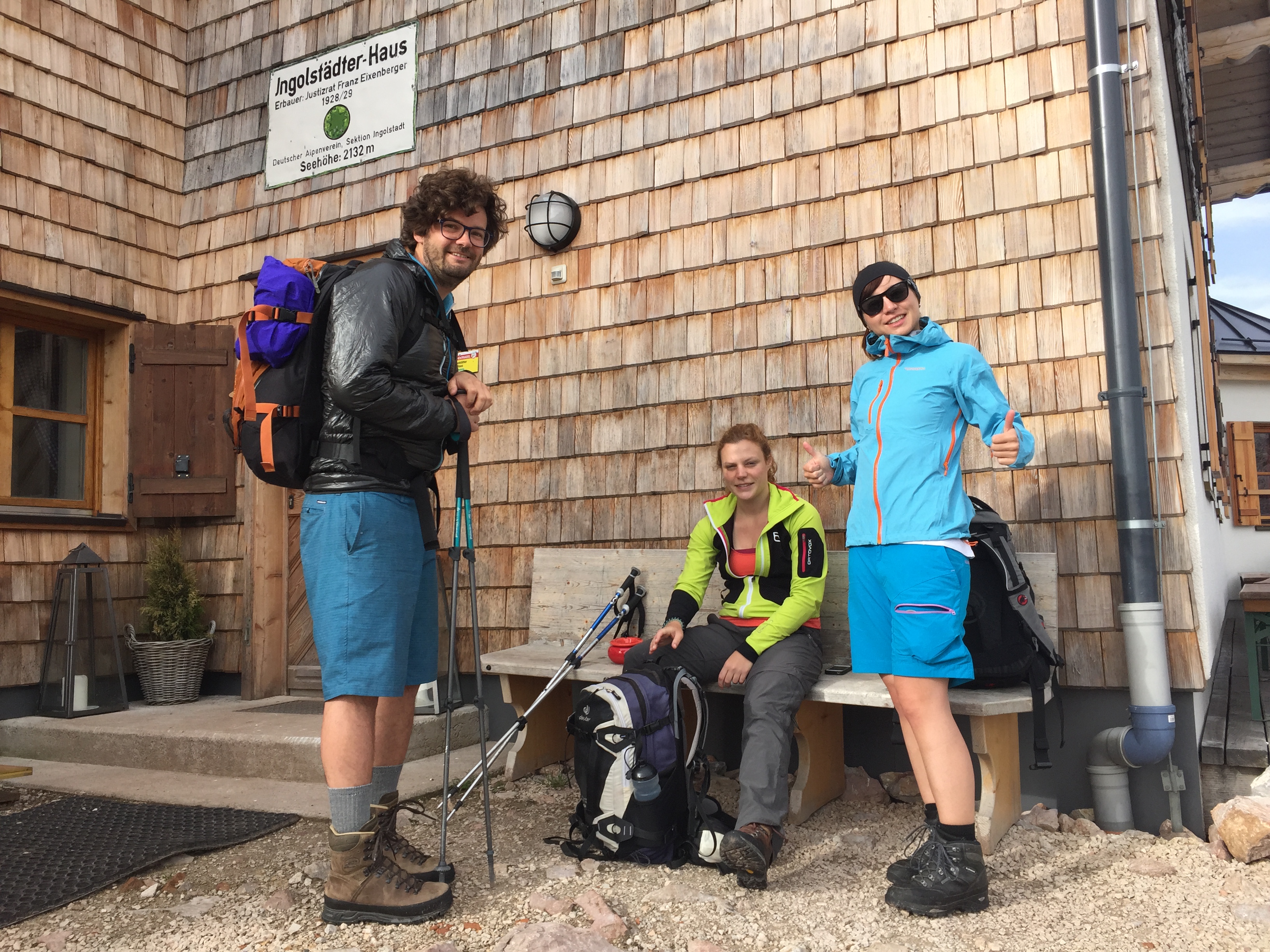 Wie weit noch? 3 Stunden steht auf dem nächsten Schild, ein bisschen steht allen der Schock ins Gesicht geschrieben, wir sind seit 4,5 Stunden unterwegs. Immer noch drei? In diesem Moment kann sich keiner vorstellen noch so lange zu laufen. Aber weiter hinauf, ruft der Berg, und wir folgen. In einen Kessel hinein, die ersten Schneefelder überqueren und dann eine Steigung, die mehr Klettern als Wandern erfordert. Aber hier machen wir fast 250 Höhenmeter gut, es geht voran. Eine Frauengruppe, die uns entgegenkommt, sagt es seinen keine weiteren Gewitter mehr vorhergesagt. Mehr Schneefelder kreuzen unseren Weg und wir die Schneefelder, wir steigen wie auf Stufen, die in den Schnee getretene Fußabdrücke sind. Nach jeder Kuppe scannen wir die Landschaft, wann taucht endlich das Ingolstädter Haus auf? Mittlerweile sind es 7 Stunden, ohne große Pause. Eine weitere müssen wir noch aushalten, dann haben wir es geschafft. Im Schatten des großen und kleinen Hundstod liegt unsere Hütte. Wir sind da! 18 Uhr. Der einzige Wunsch eines Verdurstenden ist ein Glas Wasser, der einzige Wunsch eines erschöpften Wanderers ist es die Schuhe auszuziehen. Und ein Getränk. Aber statt Wasser vielleicht eher eine Apfelschorle oder ein Russ oder ein Skiwasser.