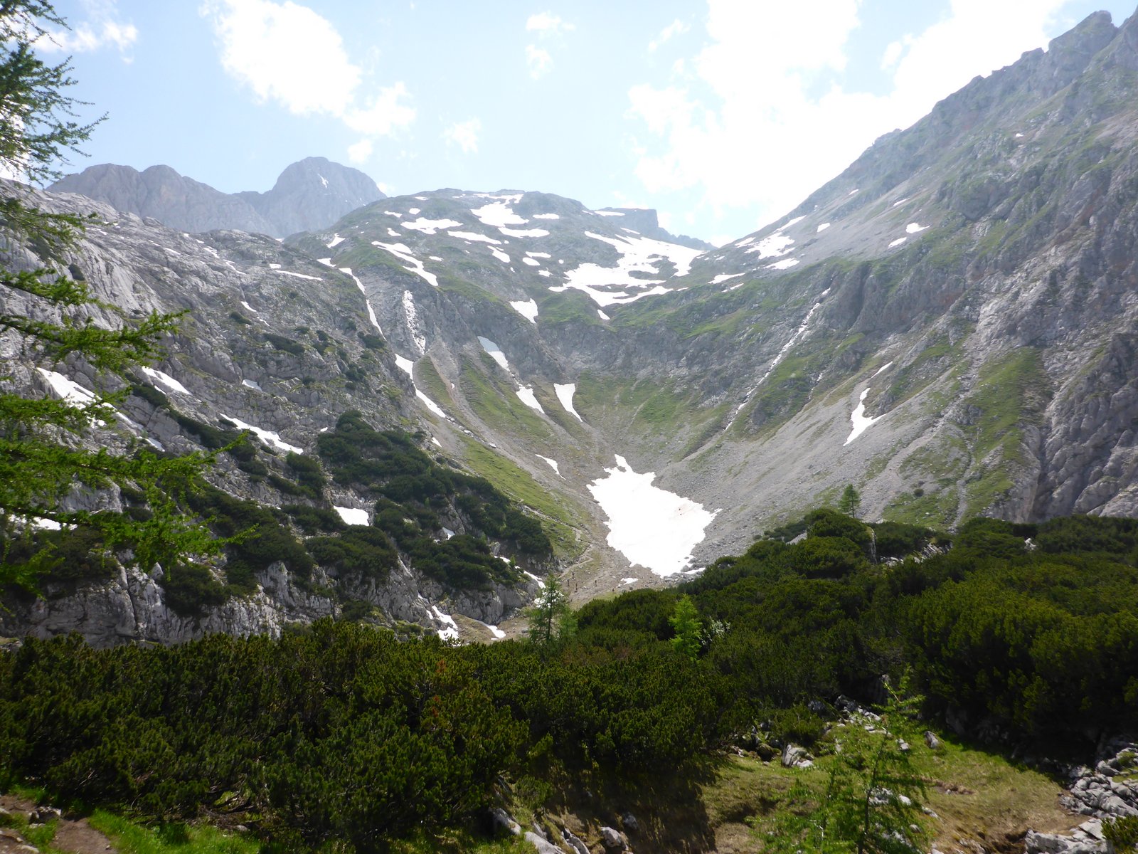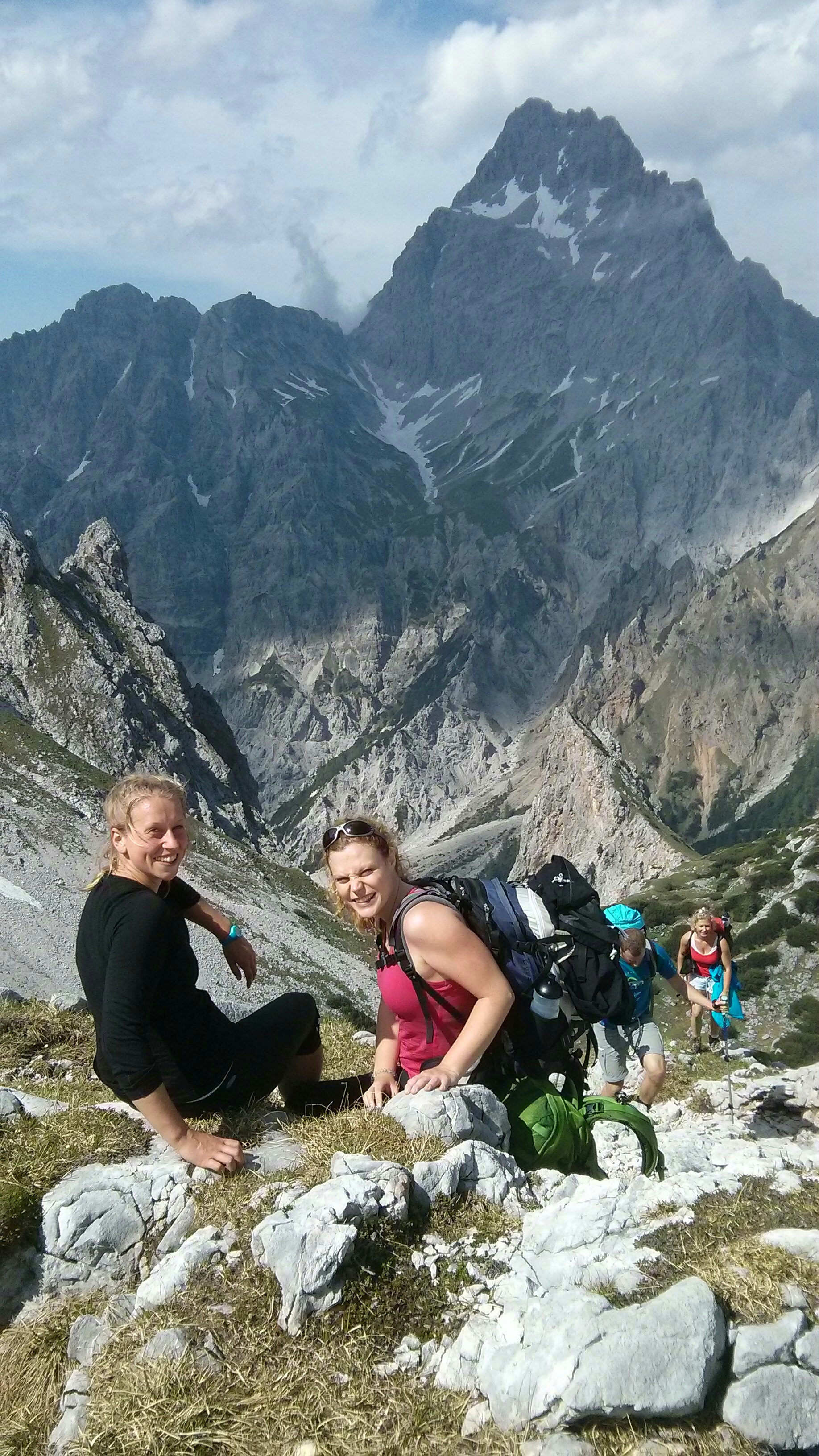 Weiter hinauf, ruft der Berg. So folgen wir und lesen auf den Schildern noch immer nicht Ingolstädter Haus. Wir schrauben uns hinauf, bald über mehr Stein als Stock, Meter für Meter. Der Höhenmesser in Bastis Uhr ist unsere Hoffnung, dass die Zielhöhe – 2100m – bald erreicht ist, und unsere Verzweiflung, weil er so langsam nach oben kriecht. Als der Wasservorrat nach drei Stunden knapp wird füllen wir an einem kleinen plätschernden Bach die Reservoirs wieder auf. Kaltes Wasser rinnt vom Berg durch Gesteinsschichten direkt in unsere Flaschen, wir trinken, füllen wieder auf, trinken, füllen wieder auf. Das Gesicht und die Handgelenke gekühlt trägt die Frische ein Stück den Berg hinauf. Aber bald verdunstet die Erleichterung mit dem Wasser in der Hitze des Nachmittages. Das Schwein mutiert langsam aber stetig zum Schweinehund und grunzt gehässig in meinen Nacken.