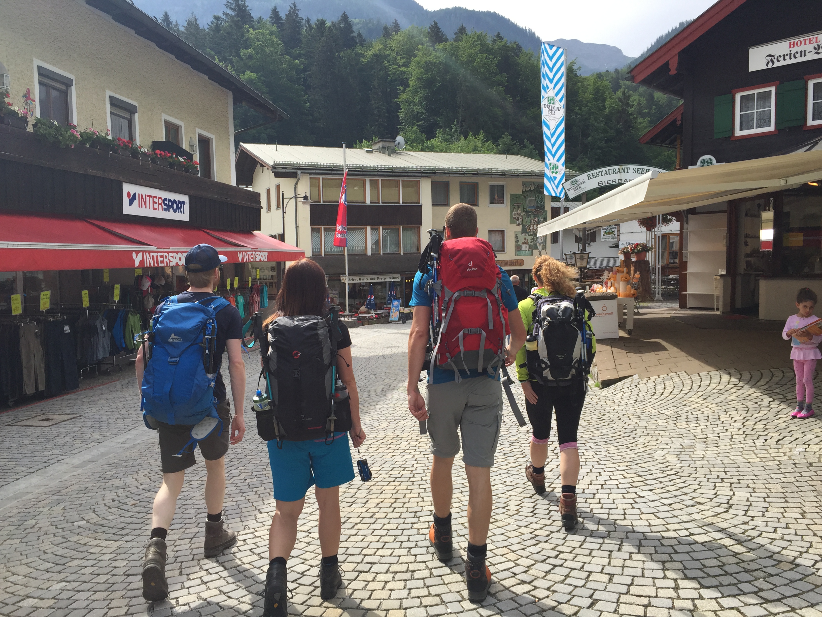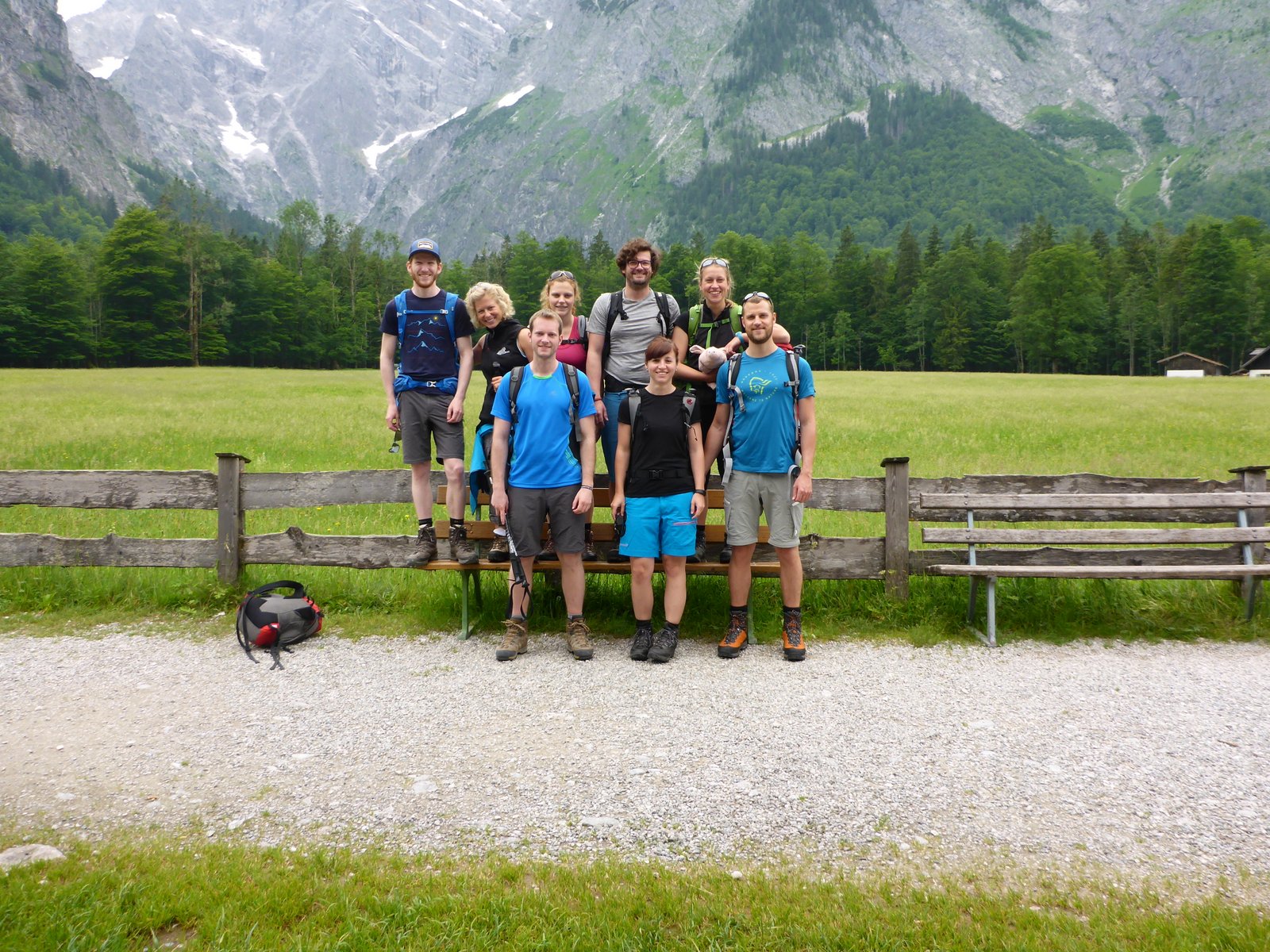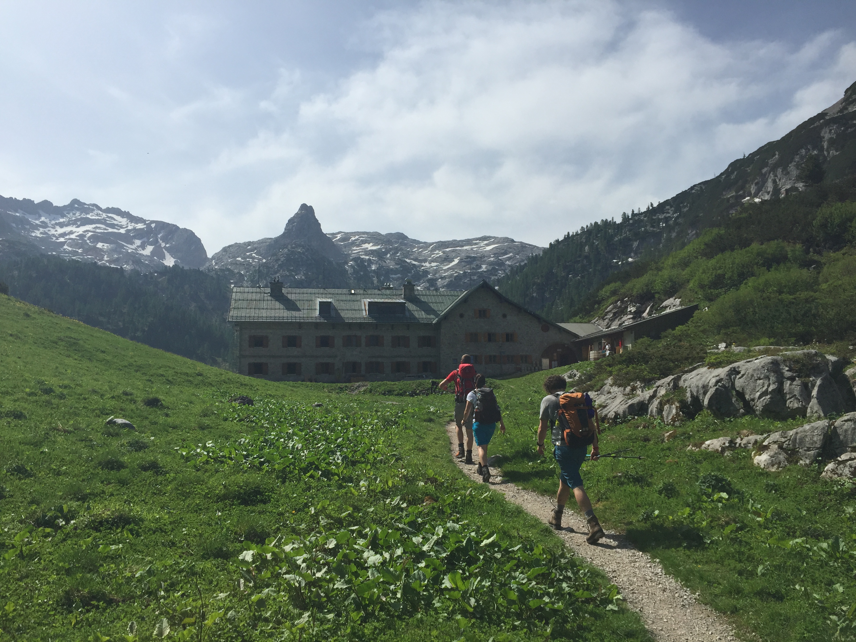 Der Rest ist schnell erzählt. Essen, Duschen, Schlafen. Am nächsten Morgen brechen wir nach einem reichhaltigen Frühstück um 8:00 Uhr auf. Vor uns liegen 6 Stunden Abstieg, sechs Stunden Tortur für Knie und Schienbeine. Und so mancher hat sich heftigste Blasen bei dem gestrigen Gewaltmarsch erarbeitet, „leichte Rötungen“ wie Joseph es galant formuliert. Aber mittlerweile können wir leiden. Und das Wetter ist uns wohlgesonnen, Sonne bescheint uns und scheint uns zu dieser frühen Stunde schon viel zu warm. Wir laufen und laufen, sehen Murmeltiere und pausieren am Kärlingerhaus, das sich mit dem romantischen Funtensee und leckerem Käsekuchen schmückt, schmeckt auch um 10 Uhr am Vormittag. Die Saugasse hat ihren Namen verdient und tut nochmal richtig weh, bergab geht es in harten, steilen Zick-Zack Kehren, aber da wir nichts lieber als Höhenmeter verlieren wollen ist dieser Abstieg nur effektiv. Das Hikers’ High setzt danach ein, an einer Kreuzung im Wald verkündet ein gelbes Schild: noch eine Stunde bis St. Bartholomä. Challenge accepted! Im Stechschritt geht es hinunter, aller Schmerz vergessen, wie Pferde, die den Stall wittern, traben wir dem See entgegen.