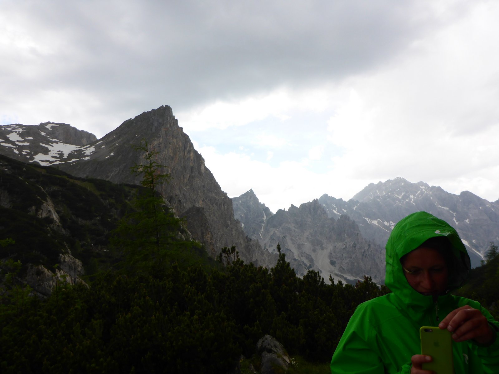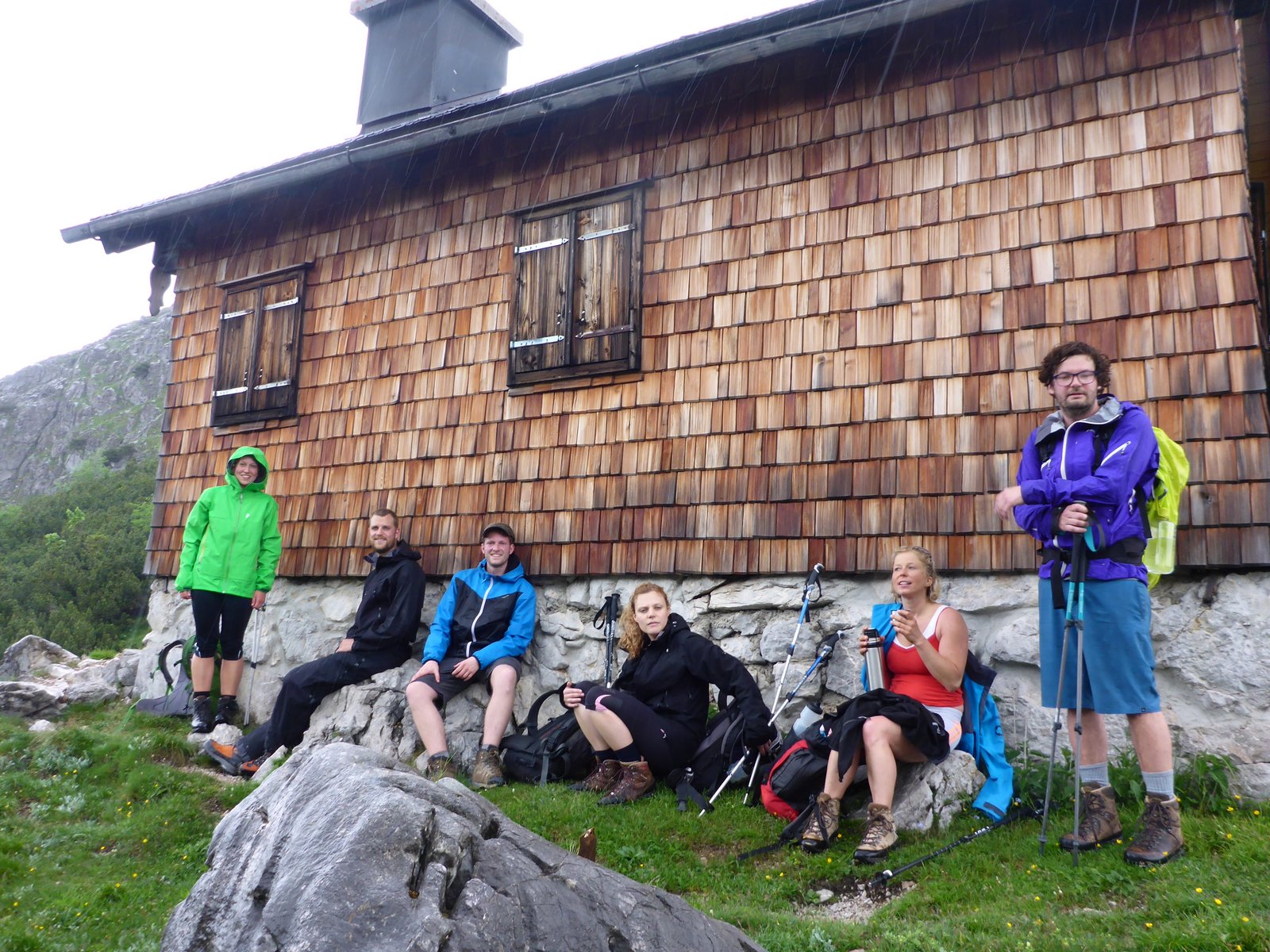 Dann rollt das Gewitter heran. Es kracht das erste Mal in der Ferne, die Bergkette am Horizont hinter uns ist in eine dunkle bedrohliche Wolke gehüllt. Wir hasten voran, wissend, dass der auffrischende Wind nichts Gutes bedeuten kann. Die Blicke wandern zum Wegesrand, noch sind wir nicht schutzlos ausgeliefert. Felsbrocken können Schutz bieten. Aber je weiter wir uns hinauf bewegen, desto freier wird das Gelände. Die ersten schweren Tropfen fallen und alle Hoffnung, dass das Wetter an uns vorbeizieht, hat sich in leichte Panik aufgelöst. Ich murmle vor mich hin, das ist nicht gut, was tun? Jetzt schon hinhocken? Nicht hinlegen, zu viel Kontakt zum Boden, hocken ist besser, und alles Metall weg vom Körper. Es grollt wieder. Der Weg biegt sich um eine Ecke, dahinter taucht in einiger Entfernung ein silberner Mast auf, der aussieht wie eine Antenne. Sie reckt sich dem Himmel entgegen als würde sie um den nächsten Blitzschlag betteln. Nicht gut! Nicht näher ran! Karo und Matthias waren schon ein Stück voraus, sie kommen zurück und deuten auf den gegenüberliegenden Hügel, eine Hütte! Mit einem Puls von mindestens 180 kommen wir oben an, mittlerweile hat es kurz gehagelt. Eine Jägerhütte, verschlossen, und ziemlich ausgesetzt…aber wir verharren hier 20 Minuten bis das Gewitter abzieht. Bald sind die Regenjacken wieder zu warm, der graue Himmel längst vergessen. Sonnentag!