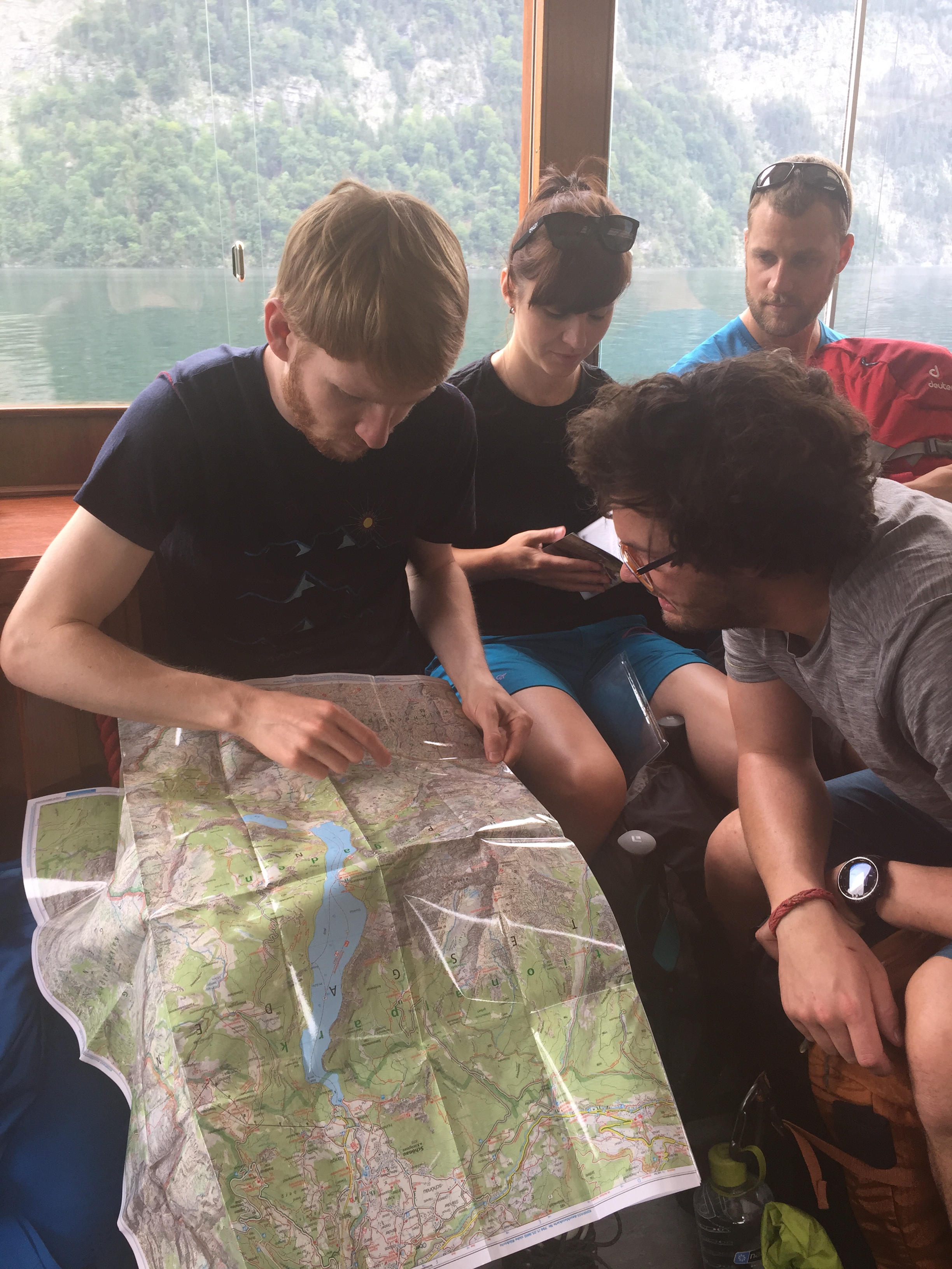 Wie ein norwegischer Fjord windet sich der Königssee dunkel und schmal durch das Tal, rechts und links steigen bewachsene Berghänge aus dem Wasser empor. Es wirkt, als habe der See die grobe Geologie besänftig und den Riss zwischen zwei mächtigen Felsmassiven wie eine Badewanne ausgefüllt. Nur, dass er auf Badende wenig einladend wirkt, selten ist ein Strand zu sehen und 192m vertikale Dunkelheit an der tiefsten Stelle lassen einen friedlichen Schwimmer eher erschaudern als frohlocken. Wenn man mal eine Leiche verschwinden lassen möchte … Karo verlegt ihr für den Rückweg geplantes Triathlontraining gedanklich gleich mal lieber in den Chiemsee. Es ist 9:45 Uhr. Wir schippern still dahin, kein Windhauch kräuselt die Wasseroberfläche. Es ist schwül, Gewitter sind für den frühen Nachmittag vorhergesagt. Laut Radio könnte später auch die Welt untergehen. Wir sind früh in München aufgebrochen um dem Schlimmsten zu entgehen, die Tour abzusagen kam nicht in Frage. Es wird schon gut gehen! Als der Bootsführer beginnt gegen die berühmte Echowand zu trompeten ist die Harmonie so perfekt wie trügerisch.Die Karte ausgefaltet auf dem Schoss nochmal die Route abgehen. Wir rechnen mit 6 Stunden, 7 mit Pause vielleicht. Das hat meine Recherche ergeben. Matthias misst mit den Fingern die Kilometer an den Kästchen nach, hier sehen die Höhenlinien eng aus, steile Anstiege, da ist es besser, wir entscheiden uns am ersten Tag einen anderen Weg zu nehmen als ursprünglich geplant.
