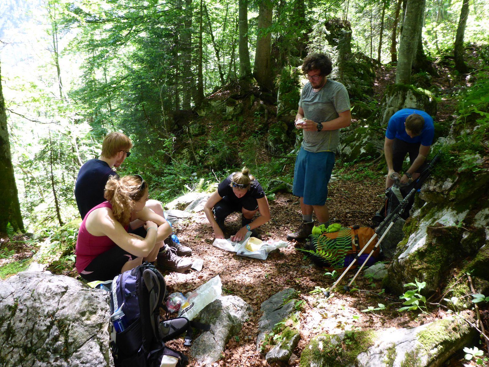 St Bartholomä ist ein konstruiertes Idyll, gemacht für Pauschaltouristen, die in Gruppen tagtäglich in das kleine ehemalige Fischerdorf mit der zwiebeltürmigen Kirche strömen. Vom Boot spazieren sie entlang des Pfades am See, wer es weit bringt schlappt noch ein paar abenteuerliche Meter ins weißkiesige Flussbett, dann schleunigst in den Biergarten und zurück aufs Boot. Wir schieben uns durch die Massen an ihnen vorbei, stechen aus der Menge heraus durch unsere klobigen Wanderschuhe, die bunten Rucksäcke und ganz sicher durch unsere Jugendlichkeit. Ein letztes Vorher-Foto, dann reihen wir uns ein, wie eine Seilschaft marschieren wir zu acht entlang des Ufers. Bald beginnt der Weg anzusteigen und die Schwüle lässt den Schweiß tropfen, dann rinnen. Die Hemden werden fleckiger, aber noch sind wir guten Mutes. Es geht bergauf, wir sind wohlauf und die Beine noch nicht müde. Der Wald spendet Schatten. Das Schwein im Rucksack grunzt zufrieden, es freut sich über die Bergluft in seinem Rüssel. Nach einer Stunde eine erste kleine Bergrast im Wald, Südtiroler Schinken und Pustertaler Bergkäse geben eine (Achtung Wortwitz!) ‚wandervolle’ Vesper ab, Joseph klemmt das Brot unter den Arm und schneidet dicke, unregelmäßige Scheiben mit dem Taschenmesser davon ab.