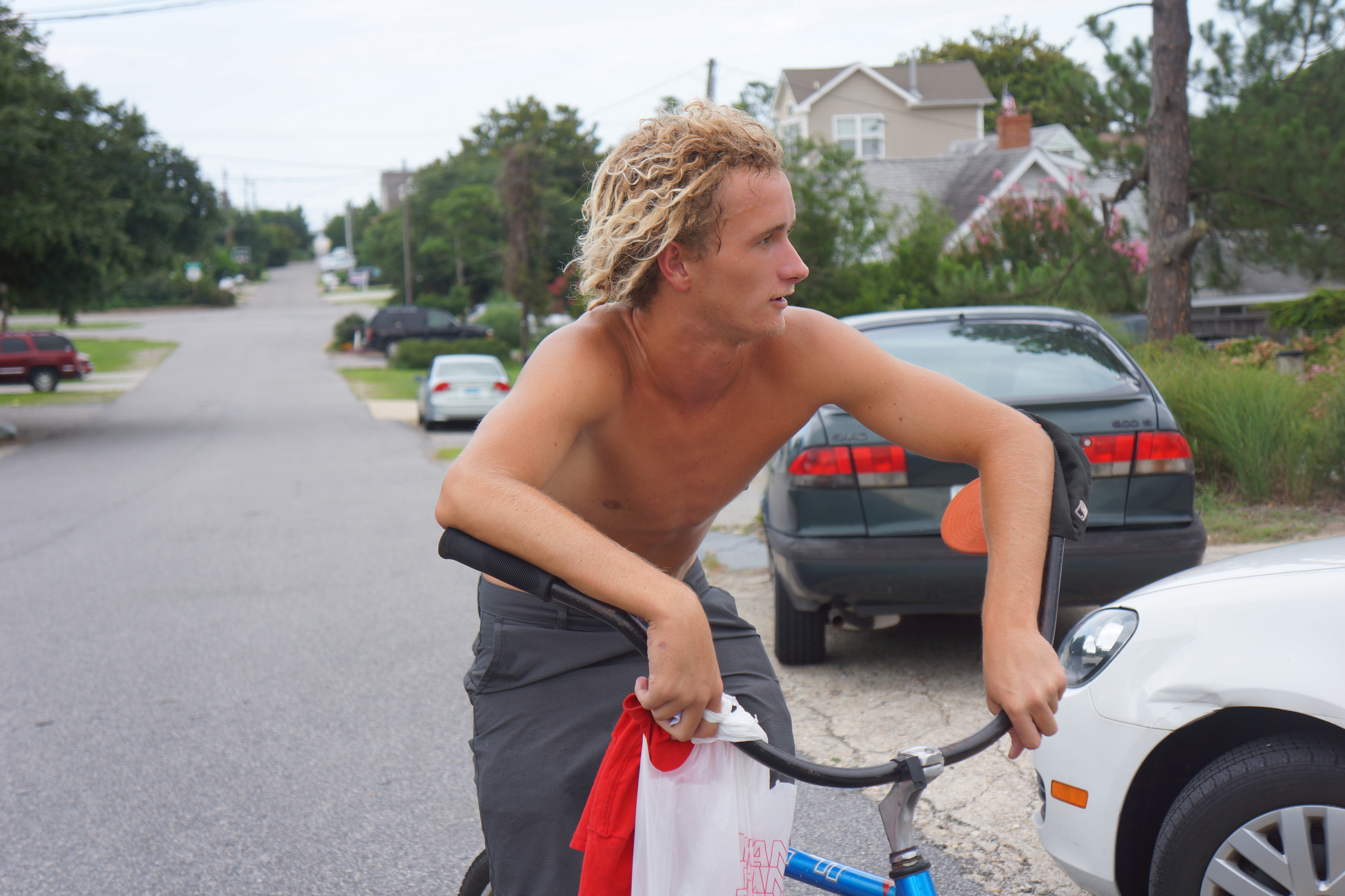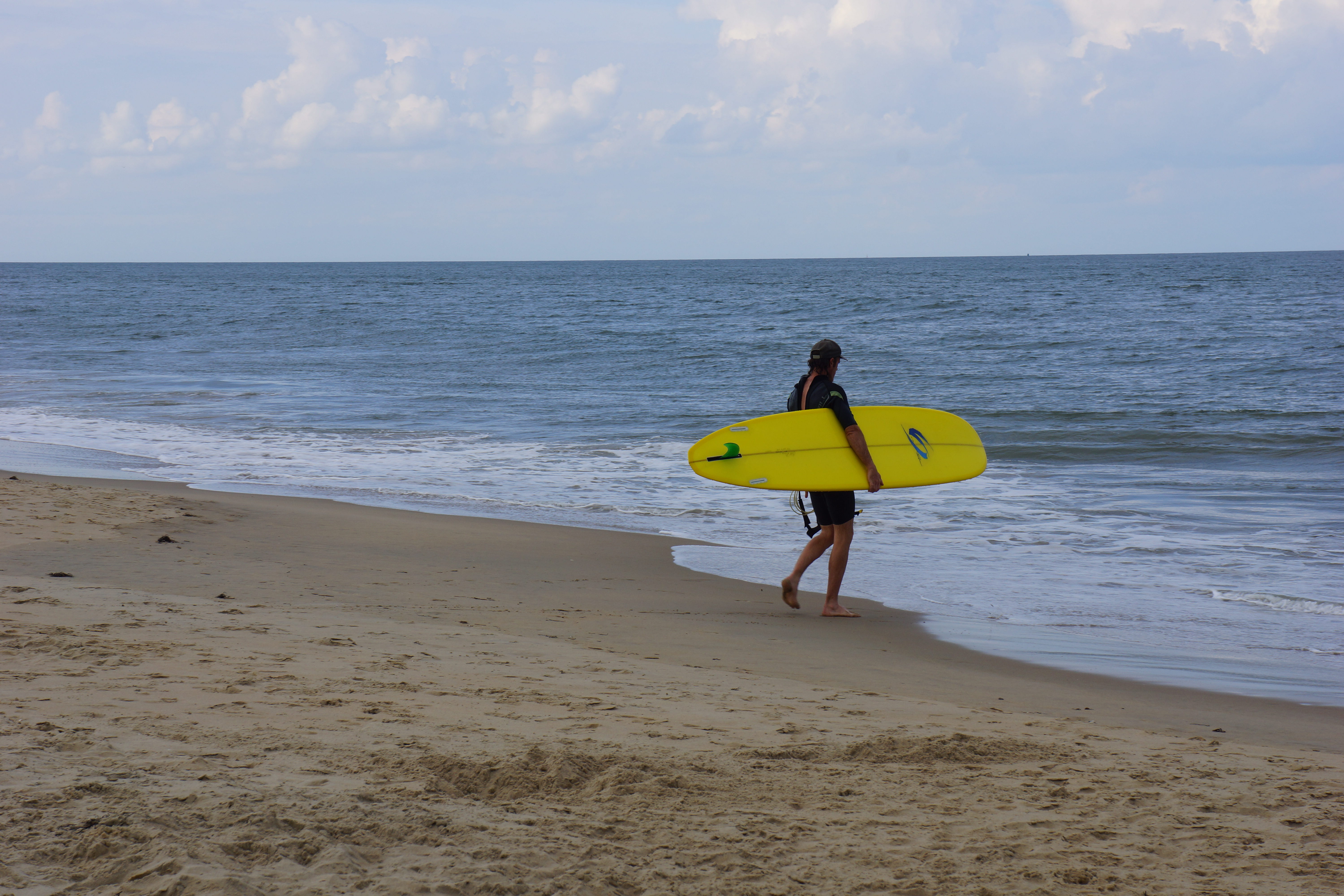 Im Java Surf Cafe schüttelt mir Dwayne die Hand, fragt ob ich hier zu Besuch bin und nachdem ich nicke sagt er „this is gonna be your favorite Spot in Virginia Beach“. Damit könnte er recht haben. Hier hängen Bilder von Hawaiiblumen und Kolibis an den Wänden, Acryl auf Leinwand in tropischen Farben, Quallen und Seepferdchen und Landschaftsmalerien langer Küstenstreifen. Ich bin in Virginia Beach. Ich dachte nicht, dass nach New Jersey noch mehr beach life möglich ist. Hier aber mag ich das Flair noch viel lieber, das Wasser ist sauberer und es fliesst deutlich weniger Alkohol. Ausserdem kommen Delfine hinzu, mehr Wellen, freundliche Hunde und ganz viel Gastfreundschaft. Am Boardwalk zeugen Beach Cruiser Bikes mit den hohen Lenkern von einem wirklichen Strandleben, Pinien riechen und Grillenzirpen – fast Frankreich Flair, irgendwie mediterran. Weiterhin gibt es nur das barfuessige Dasein. Ricky traegt ihnehin nie Schuhe. Ich kenne Ricky und ihren Sohn Billy von Fuerteventura, den Februar ueber haben wir 2014 dort zusammen gewohnt und gesurft. Hier lerne ich ihr amerikanisches Leben und den Rest der McGarry Familie kennen. Wieder unter locals! Gleich am ersten Tag werde ich zum Segelbootreparaturgehilfen von Billy’s Vater Jim. Danach hole ich gleich sein Auto von der Werkstatt ab, cruise anschliessend mit Ricky’s Chevy Truck die Atlantic Avenue entlang, auf dem Weg halten wir an zwei surfshops und besuchen dann Billy bei seinem summer job in einem Fast food Restaurant. Der steht in Uniform am Grill und hackt bacon in Stücke. Nach ein paar stunden in Virginia Beach bin ich schon so angekommen und integriert, dass ich mich wie zu Hause fühle.