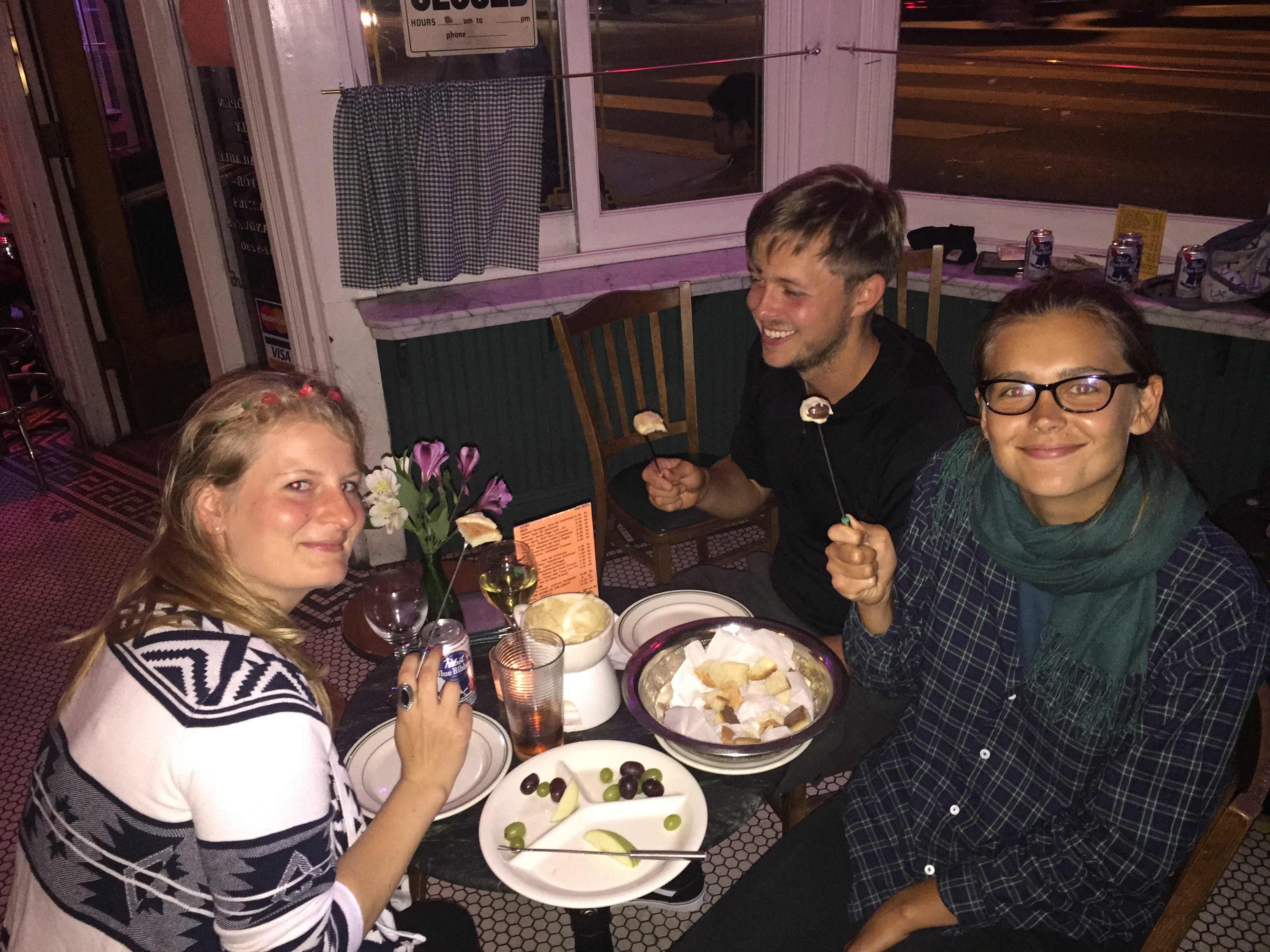 Wir nehmen alles mit, ohne zu sehr den Touri zu mimen, lassen wir uns treiben und kommen doch an alles Ikonen der Stadt vorbei. Chinatown, die bunten Häuser, die Waterfront mit ihren Seehunden und gift-shops, natürlich ein, zwei rides in der cable car. Nach einem langen Shoppingtag im Nordstrom Einkaufszentrum und dem Nordstrom Outlet etwas außerhalb hat selbst Franzi als exzentrische Nordstromanhängerin genug und einfach nur noch Hunger. Ein kleiner Park auf einem der höchsten Hügel der Stadt ist unsere kleines Geheimnis, ein Kleinod, wir entdecken ihn auf dem Weg zur berühmten Lombard Street. Asia take away food muffelnd sitzen wir in der Sonne, freier Blick auf die Golden Gate Bridge, ich ziehe Schuhe und Jacke aus, der Spätsommer bündelt seine letzten kräftigen Strahlen auf unserer Bank. Am Abend treffen wir nochmal Lena und Anton, downtown, in einer kleinen Jazzbar. Wir kaufen ein paar Dosen Bier, sitzen am Fenster und unterhalten uns soweit es die Musik zulässt, zwischendrin wird geklatscht für die Musiker. Nur drei, vier kleine Tische sind besetzt. In der Bar wird Käsefondue angeboten, Neben uns sitzen drei junge Leute, die irgendwann einfach aufstehen, zahlen und gehen. Auf ihrem Tisch bleibt ein unangetastetes Fondue zurück, gefüllter Brotkorb, Weintrauben, eine Schale randvoll mit flüssigem Käse. Anton hat Hunger und handelt: Können wir das vielleicht aufessen?, fragt er die Bedienung. Sie schaut etwas verdutzt, aber nickt dann und sagt sie habe nichts dagegen. Es wäre doch gut, wenn nicht so viel übrig bleibt und weggeschmissen wird. Anton wechselt den Platz, grinst und winkt uns hinüber. Wir zögern kurz, irgendwie komisch, sollen wir wirklich…wir folgen ihm und zwei Minuten später schieben wir uns fettige Brotstücke in die hungrigen Mäuler. Die Leute um uns herum schauen erst komisch, haben aber bald vergessen, dass dieser Tisch nicht von Anfang an der unsere war. Eine Quittung auf dem Tisch zeigt die Summe US$140, so ein Abendessen kann man sich mal gönnen, for free. Schnäppchen. Sehr sehr geil, Anton! Dazu noch der Rest Weißwein unserer unwissenden Gönner und wir fahren selig zurück ins 22-Bett-Zimmer. Luxuriöser Budgettrip!