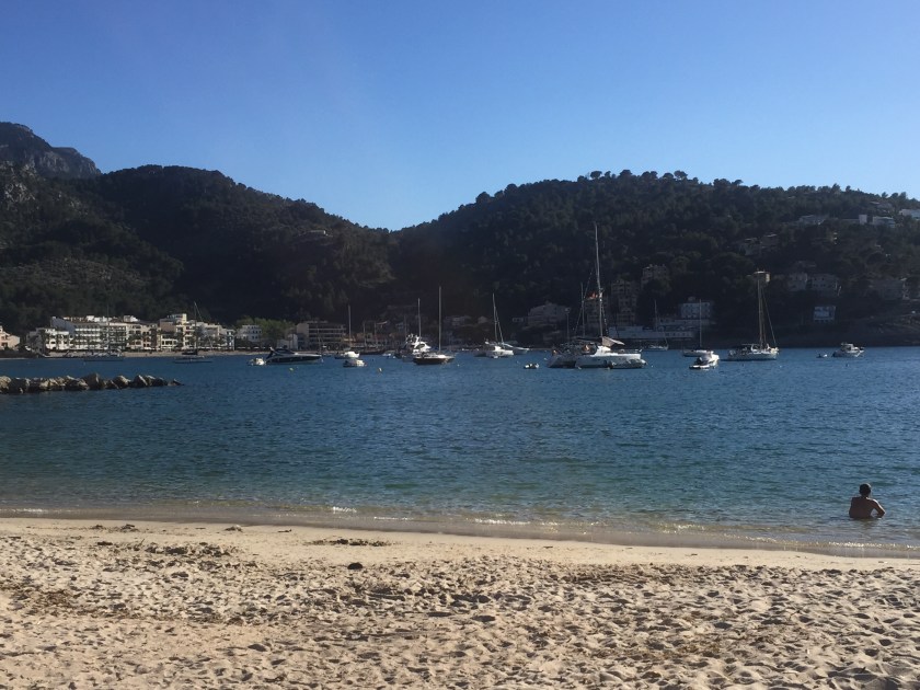 Wir erreichen das Bergdörfchen Soller ausgetrocknet und blasenreich. Das erste Café ist unseres und noch nie haben wir so schnell eine eiskalte Cola hinuntergestürzt. Wir sind heilfroh endlich angekommen zu sein. Morgen werden wir einen Pausentag einlegen, da sind wir uns einig. Ein bisschen weiter müssen wir aber noch, wir wollen noch ans Meer bis Port de Soller kommen. Aber dazu müssen wir glücklicherweise nur den Bus finden, der in der Stadt abfährt. Auf dem Weg hinunter finden wir endlich einen Trinkwasserbrunnen, um die Flaschen aufzufüllen. Ein netter alter Mallorqiner gestikuliert und will uns glaube ich zu verstehen geben, dass es sehr gutes Wasser ist. Er selbst füllt seine Kanister auf und knattert mit dem alten Golf davon. Wir laufen weiter, endlich vorbei an Orangen- und Zitronengärten. Ronja stibitzt die erste Frucht und ist glücklich. Wir sind im Sommer angekommen.