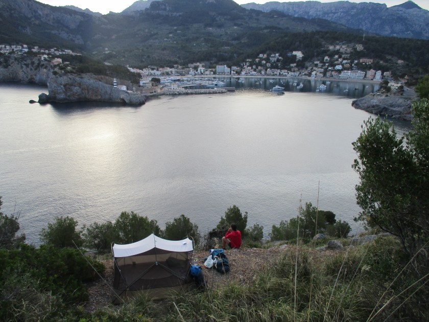 Ronja übersteht die Busfahrt so mäßig. Irgendwann kommt sie matt wieder hinter einem Gebüsch hervor und möchte in diesem Moment wirklich nie wieder in so ein Gefährt einsteigen. Die Serpentinen waren tatsächlich brutal, der Busfahrer im Bremsen und Anfahren selten unsensibel. Ich kaufe Salzstangen und Cola, Erstversorgung für gebeutelte Bustouristinnen. Es wird langsam dunkler und wir müssen uns überlegen, wo wir schlafen wollen. Auf der Karte führt hinter der Bushaltestelle ein Weg ins Grüne. Wir laufen los, erst asphaltierte gassen mit Steinmauern, dann Gestrüpp, drehen wieder um, nehmen eine andere abzweigung, der Weg wird zu einem Trail, steigt an und führt uns in bewaldete Gefilde. Links Bäume, rechts trockene Weide hinter einer Steinmauer. Irgendwoher nimmt mein Körper an diesem Abend einen ganzen Batzen Energie und ich sprinte vor, um uns ein Plätzchen zu suchen. Wieder finde ich, wie schon bei Lluc, eine Moosplattform. Wir errichten unser Zelt. Als wir gerade fertig sind stehen zwei junge Leute vor uns, ein Pärchen aus Skandinavien. Sie schauen uns ein bisschen verwirrt an – das war doch ihr Platz. Ihre Rucksäcke liegen versteckt hinter Steinen, sie waren nur kurz in die Stadt hinabgestiegen. Wir verrücken also unser Zelt und teilen uns die Plattform. Mittlerweile ist es stockdunkel. Ronja kocht noch ein bisschen Brühe im Licht der Stirnlampe. Um uns herum nur Schwärze und Waldgeräusche. Wieder mal ein ganz anderer Schlafplatz. Wieder mal ganz nahm am Busen der Natur. unvorstellbar, dass morgen schon der letzte Tag anbricht.