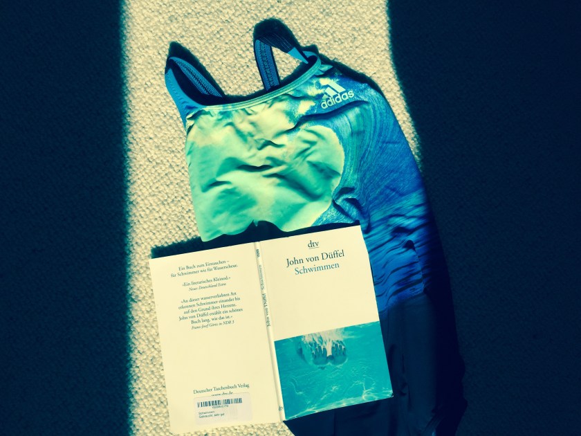‚Passiv Schwimmen‘ nennt Herr von Düffel es, das ‚Sich-treiben-lassen‘. Im Rhein bei Basel, mit der Strömung flussabwärts treiben. Nicht mal dazu bringe ich es an diesem Sonntag. Dabei ist es unter der Markise auf der Terrasse kaum auszuhalten, die Kniekehlen schon feucht, ideales Freibadwetter wäre das. Im Kopf ziehe ich bereits meine Bahnen, stoße mich ab, lasse die Beine überklappen, Rollwende, und wieder gleitend auf neuer Bahn im kühlenden Chlorwasser. Schwimmprüfung in acht Tagen. Doch ich hänge hier fest und schaffe es nicht mal die paar Meter in den kühlenden Garten zu flüchten. Lethargie hat von mir Besitz ergriffen. Statt zu schwimmen schwimme ich passiv. Lasse mich treiben, nicht den Rhein hinab, auch nicht durch die nahe Alster, nur durch die Worte. Atme dabei das Chlor des Badeanzugs. Es scheint fast, als hätte ich es ins Schwimmbad geschafft.