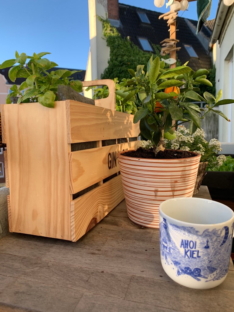 Der Morgen versöhnt mich mit der Welt. Die Clematis, mit ihren dicken Knospen und rankenden Armen, kurz vor der Blüte, aalt sich in der Morgensonne. Schnittlauch und Koriander noch im schattigen Morgentaumel, ein Tautropfen hängt am Salatkopf daneben. Crisp coolness. Der süßliche Geruch von sonnengetauchtem Steinkraut, weiß und unschuldig neben der Clematis, hängt in der Luft und vermischt sich mit dem Kaffeeduft. Ja, ich schließe Frieden mit dieser morgenstillen Welt auf Balkonien, nur für eine halbe Stunde. Friedlich in die Kuscheldecke gewickelt nach der ersten Reckung und Streckung, nach dem ersten tiefen Atemzug, mit dem ersten Kaffee und dickbestrichenem (selbstgebackenen) Marmeladendinkelbrot. 6:30, Mittwoch. Guten Morgen, keine Sorgen, seid ihr auch schon alle wach?